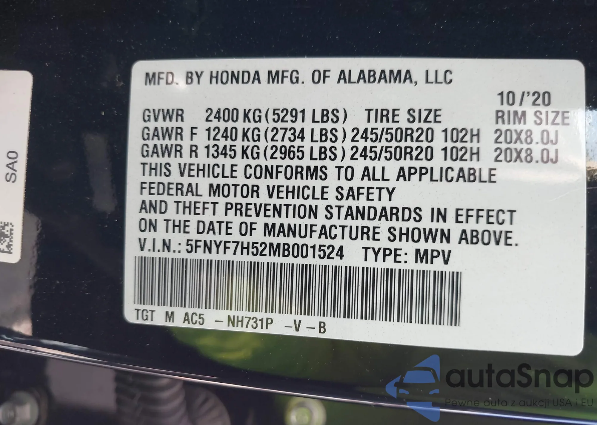 LOT: 43319187 VIN: 5FNYF7H52MB001524