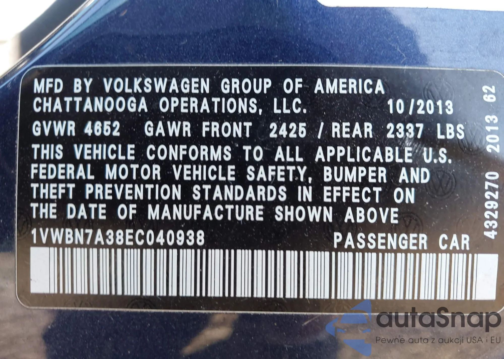 LOT: 43401178 VIN: 1VWBN7A38EC040938