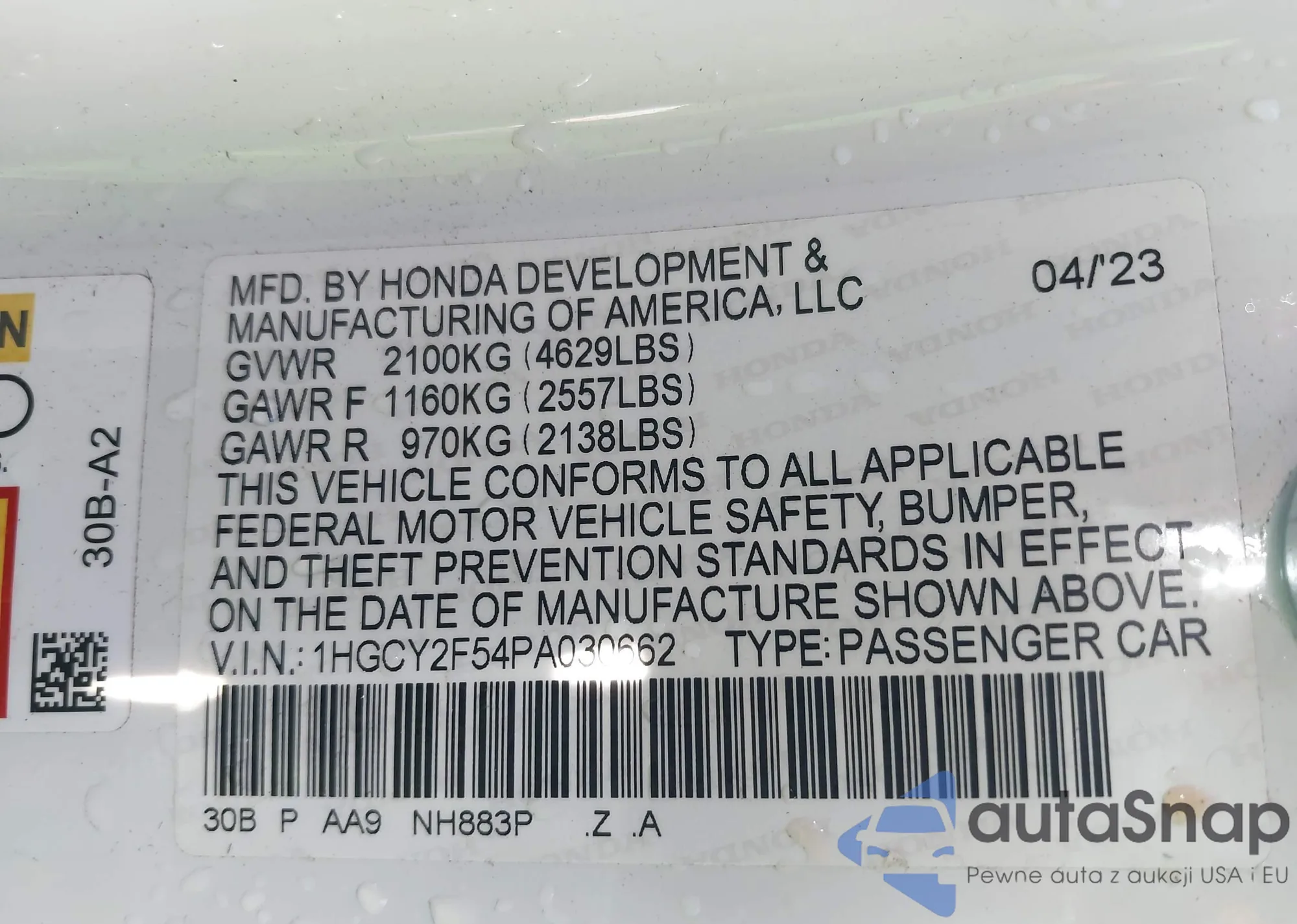 LOT: 43453603 VIN: 1HGCY2F54PA030662