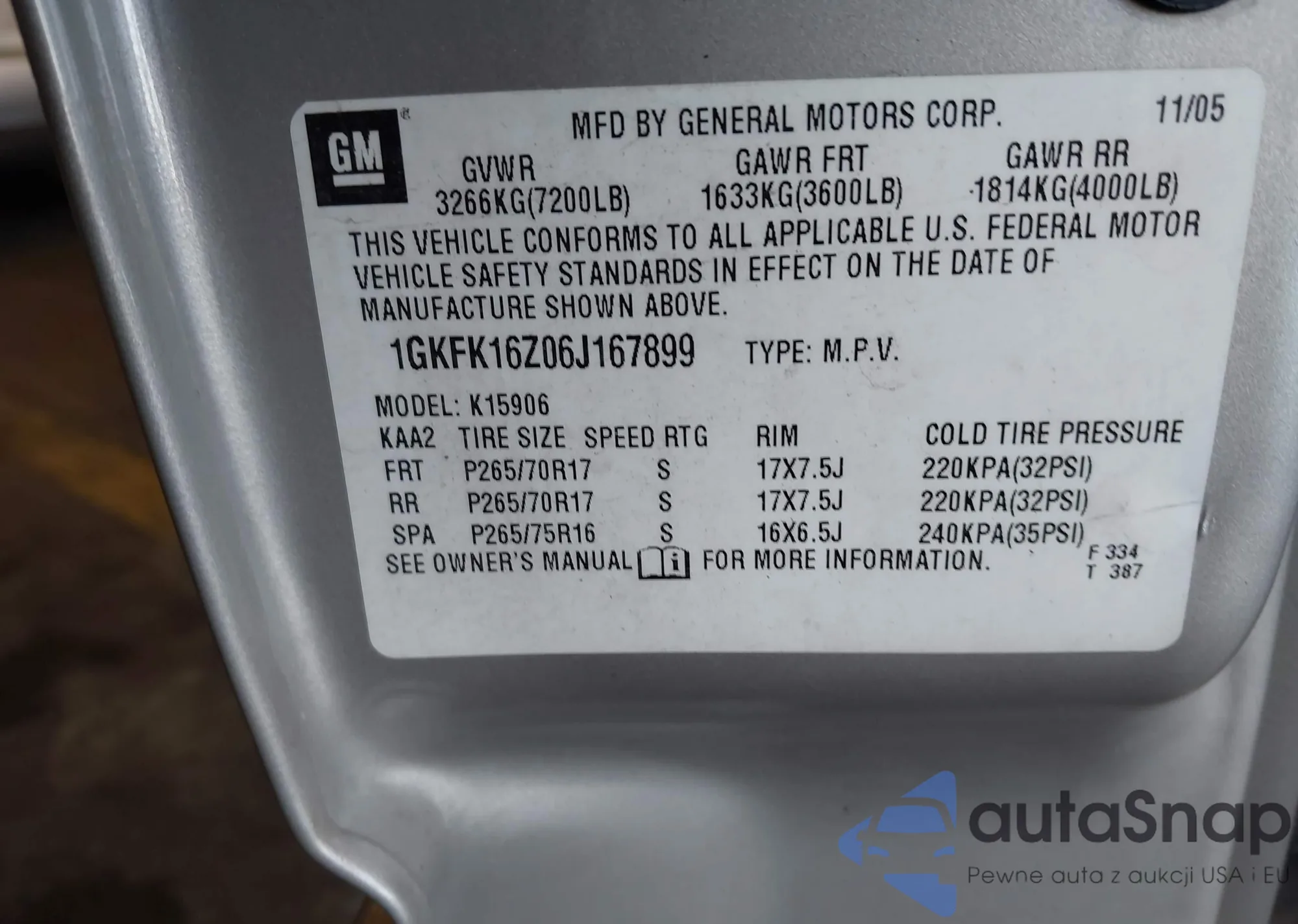 LOT: 43573811 VIN: 1GKFK16Z06J167899