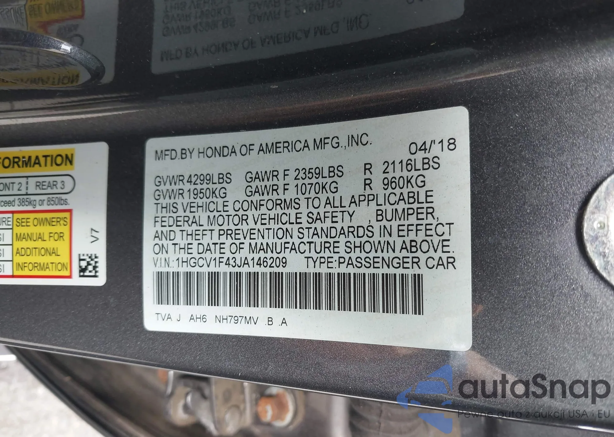 • VIN 1HGCV1F43JA146209