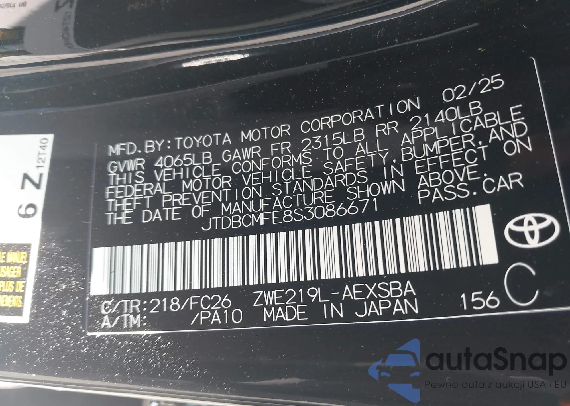 LOT: 43138095 VIN: JTDBCMFE8S3086671