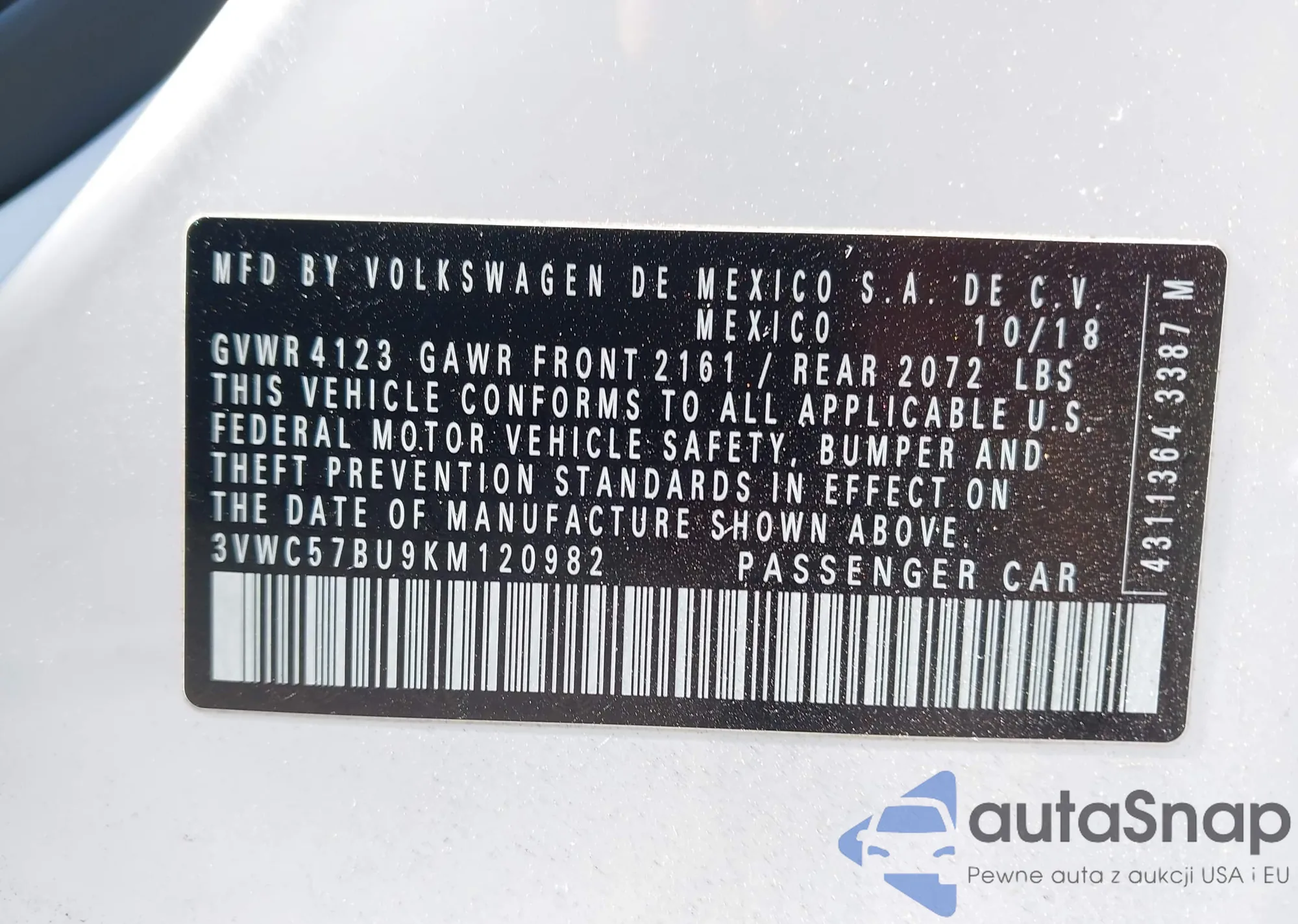 LOT: 43152372 VIN: 1VWAT7A35HC071506