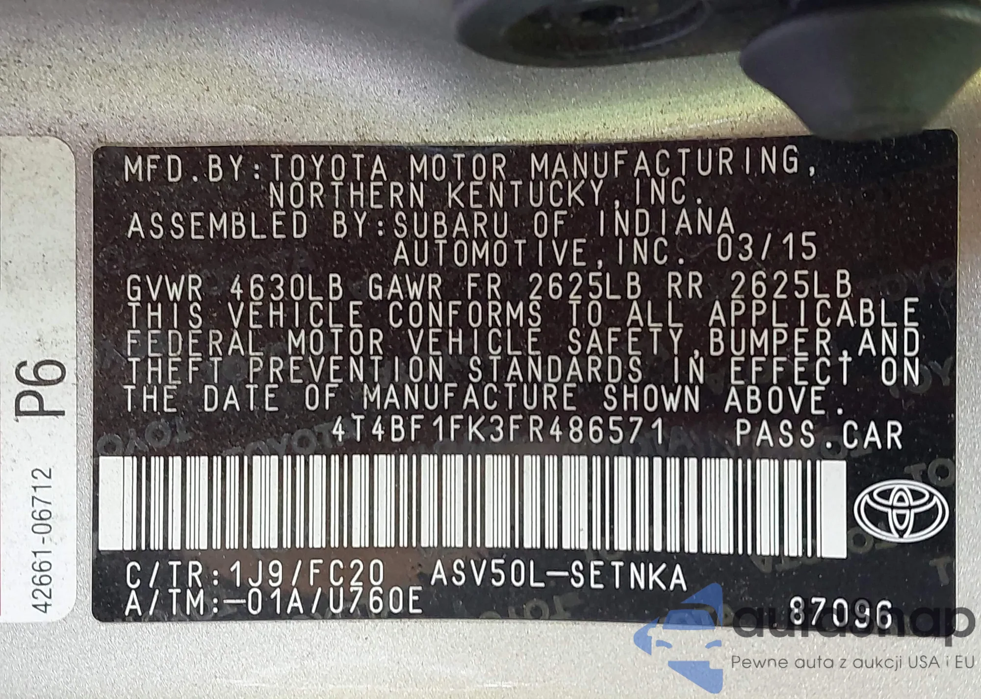 • VIN 4T4BF1FK3FR486571