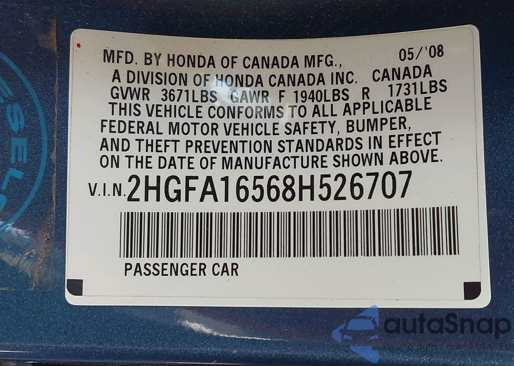 • VIN 2HGFA16568H526707
