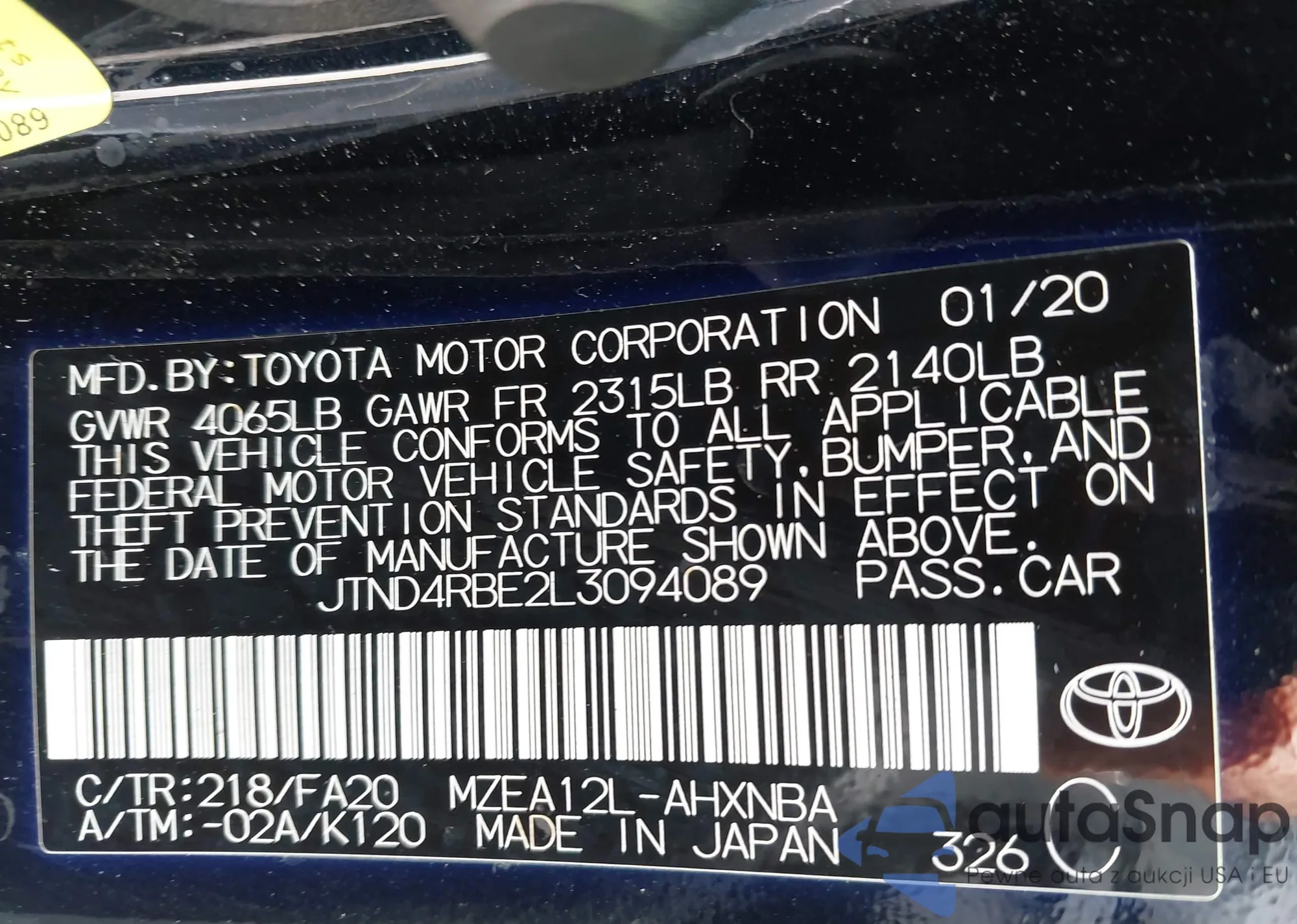 LOT: 43388106 VIN: JTND4RBE2L3094089