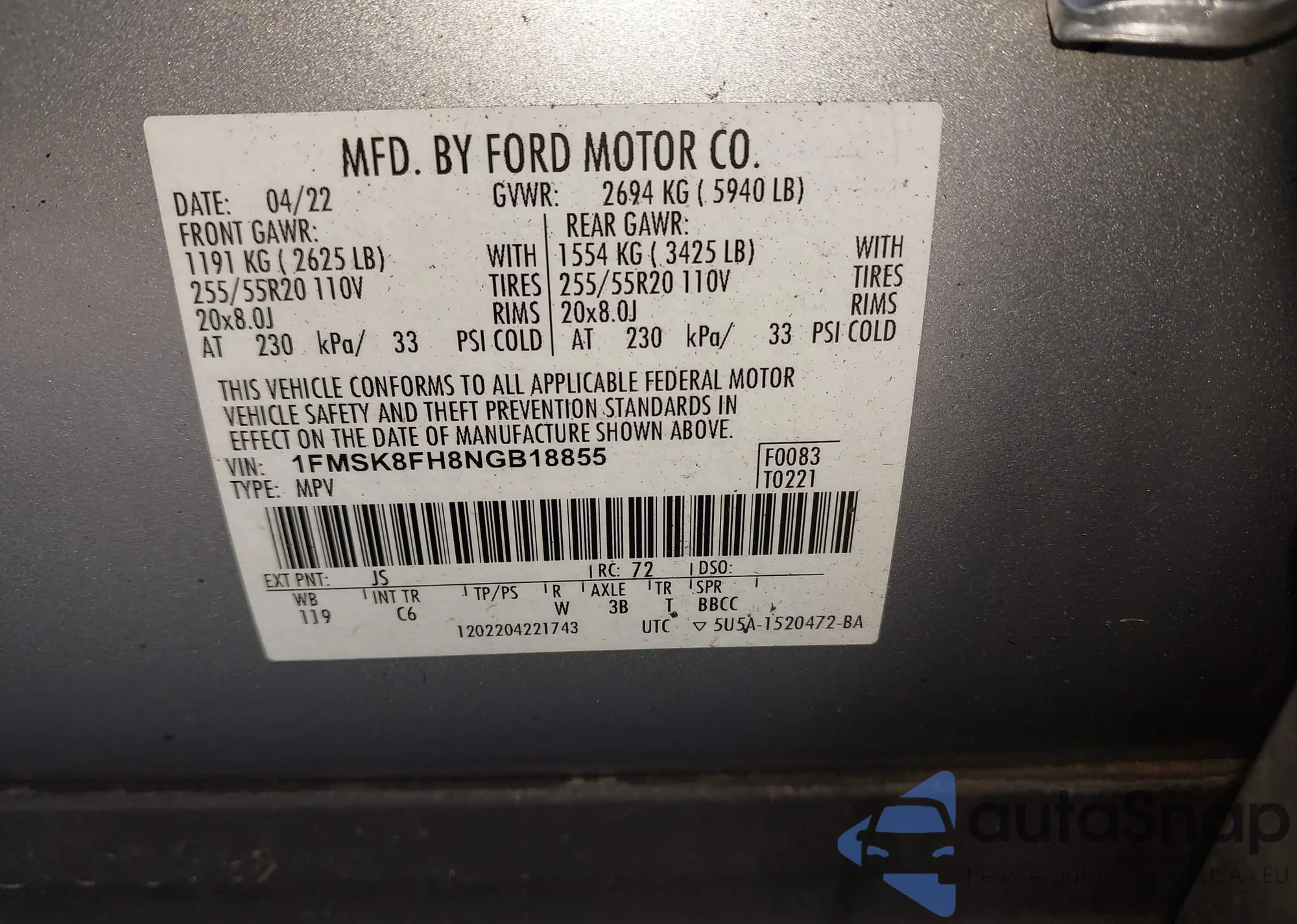 LOT: 42858102 VIN: 1FMSK8FH8NGB18855