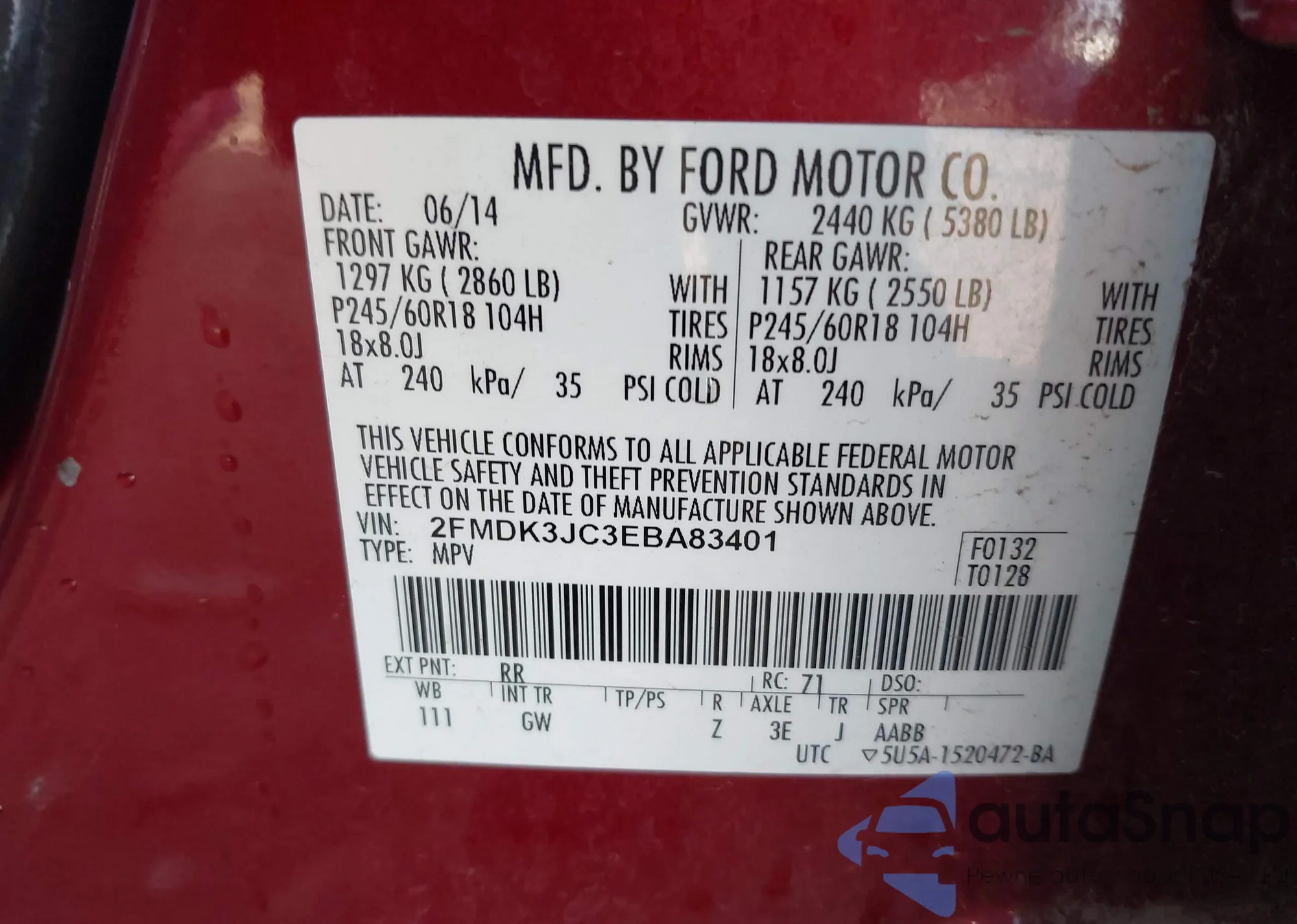 LOT: 43593092 VIN: 2FMDK3JC3EBA83401