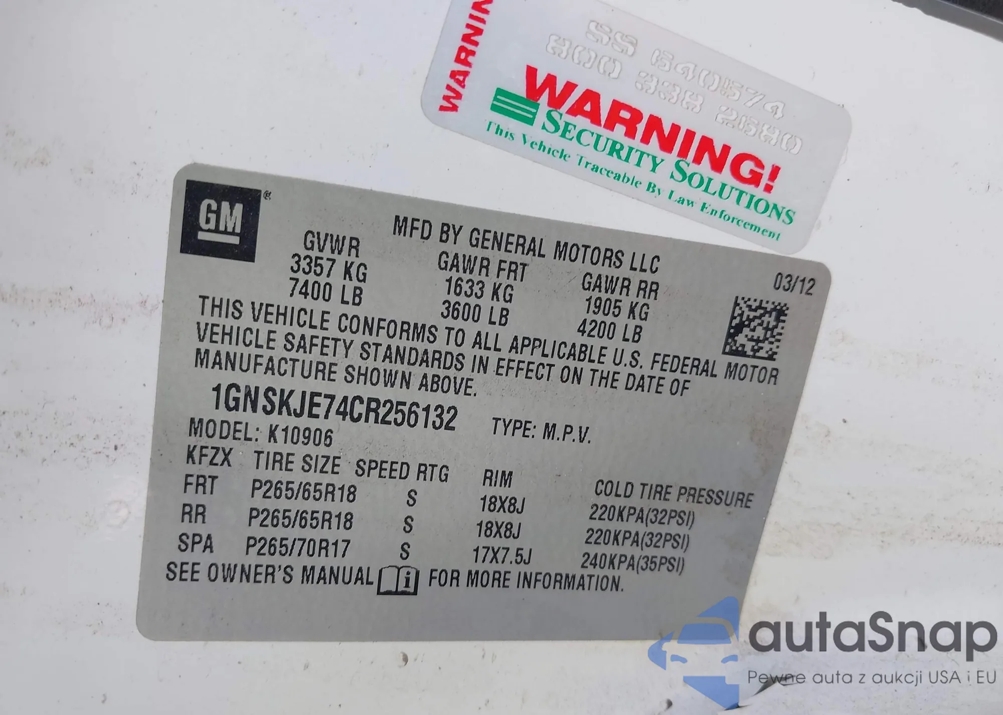 LOT: 43120737 VIN: 1GNSKJE74CR256132