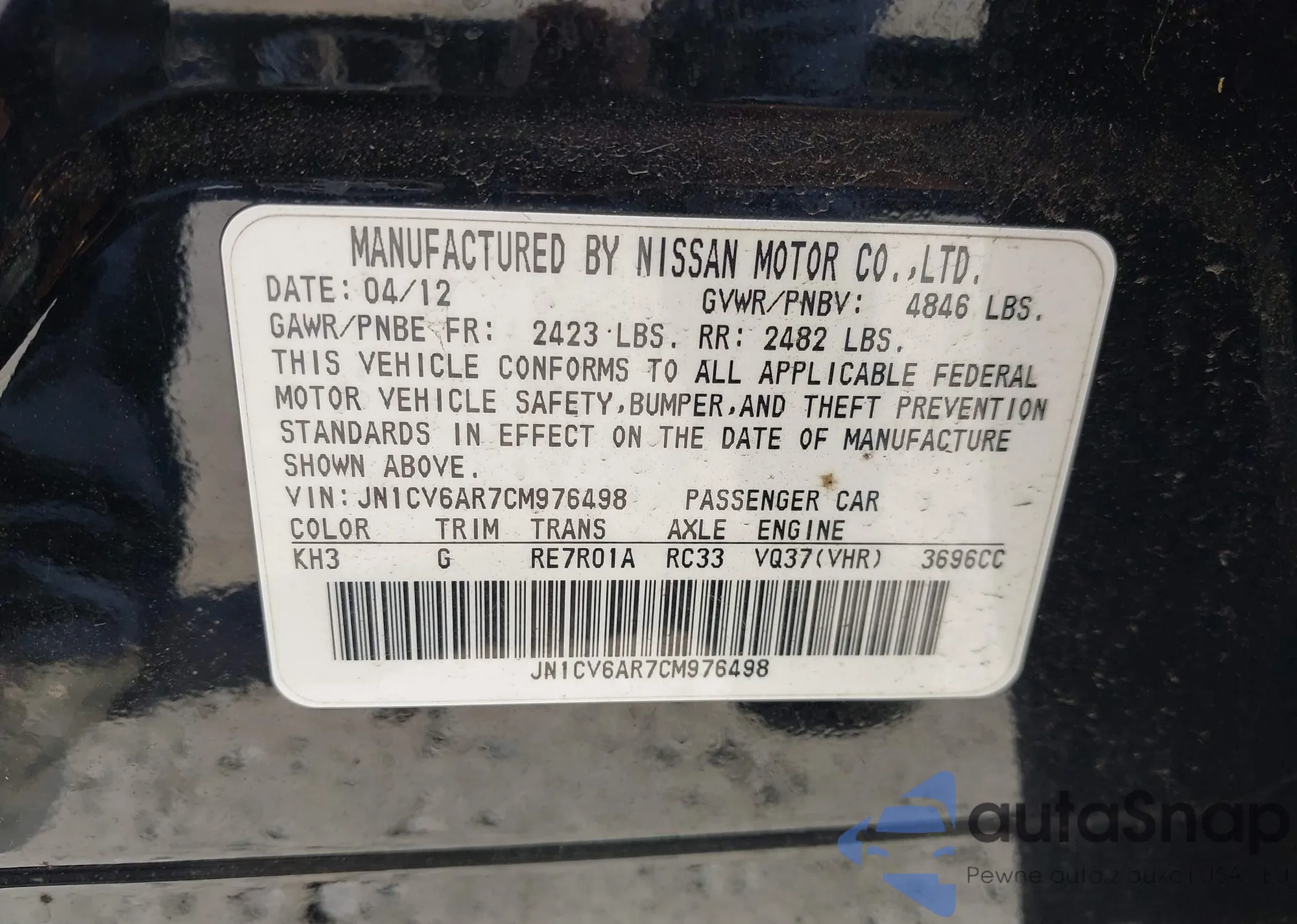 2012 Infiniti G37X from USA, damaged, VIN JN1CV6AR7CM976498