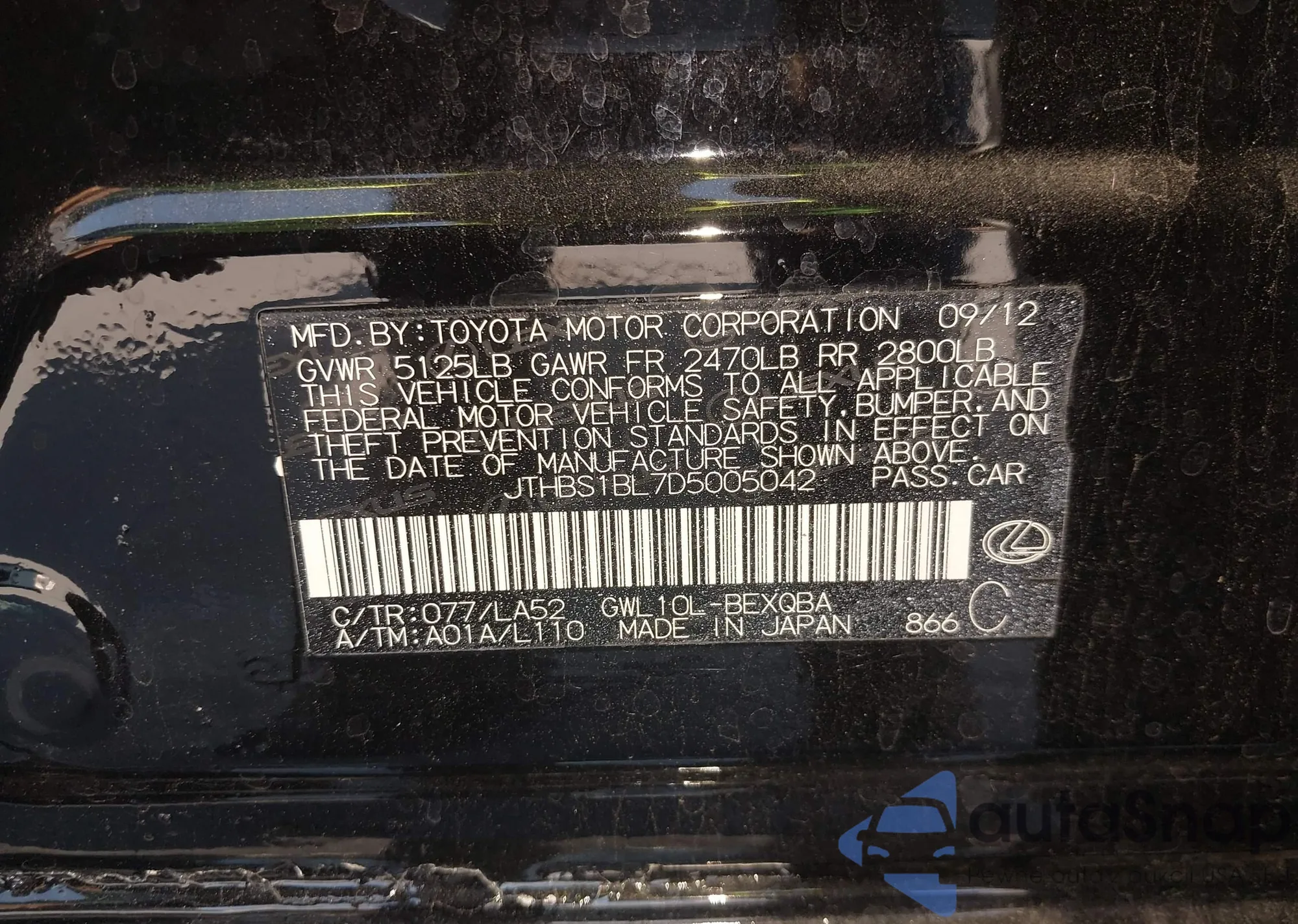 • VIN JTHBS1BL7D5005042