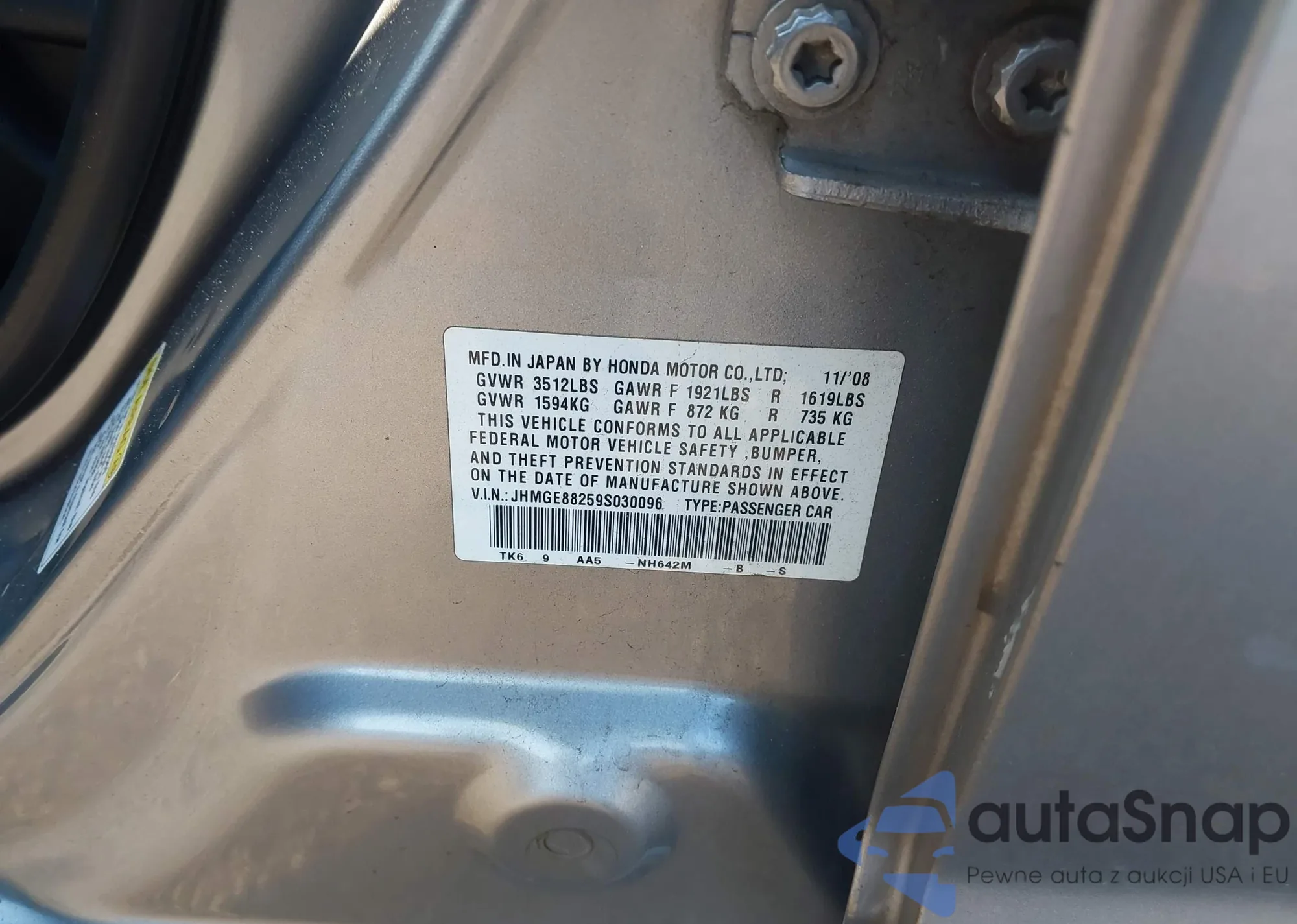 LOT: 43250764 VIN: JHMGE88259S030096