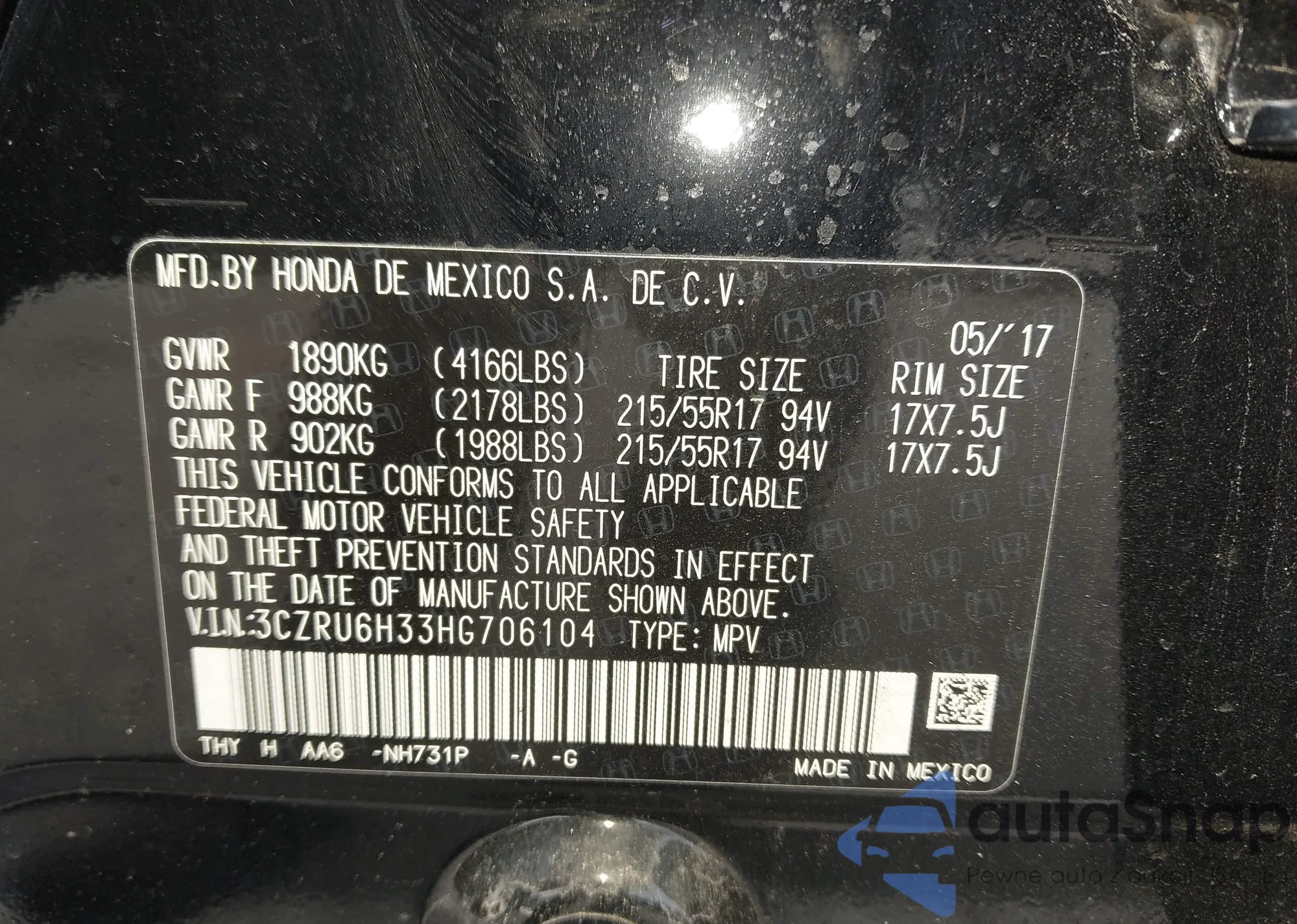 • VIN 3CZRU6H33HG706104