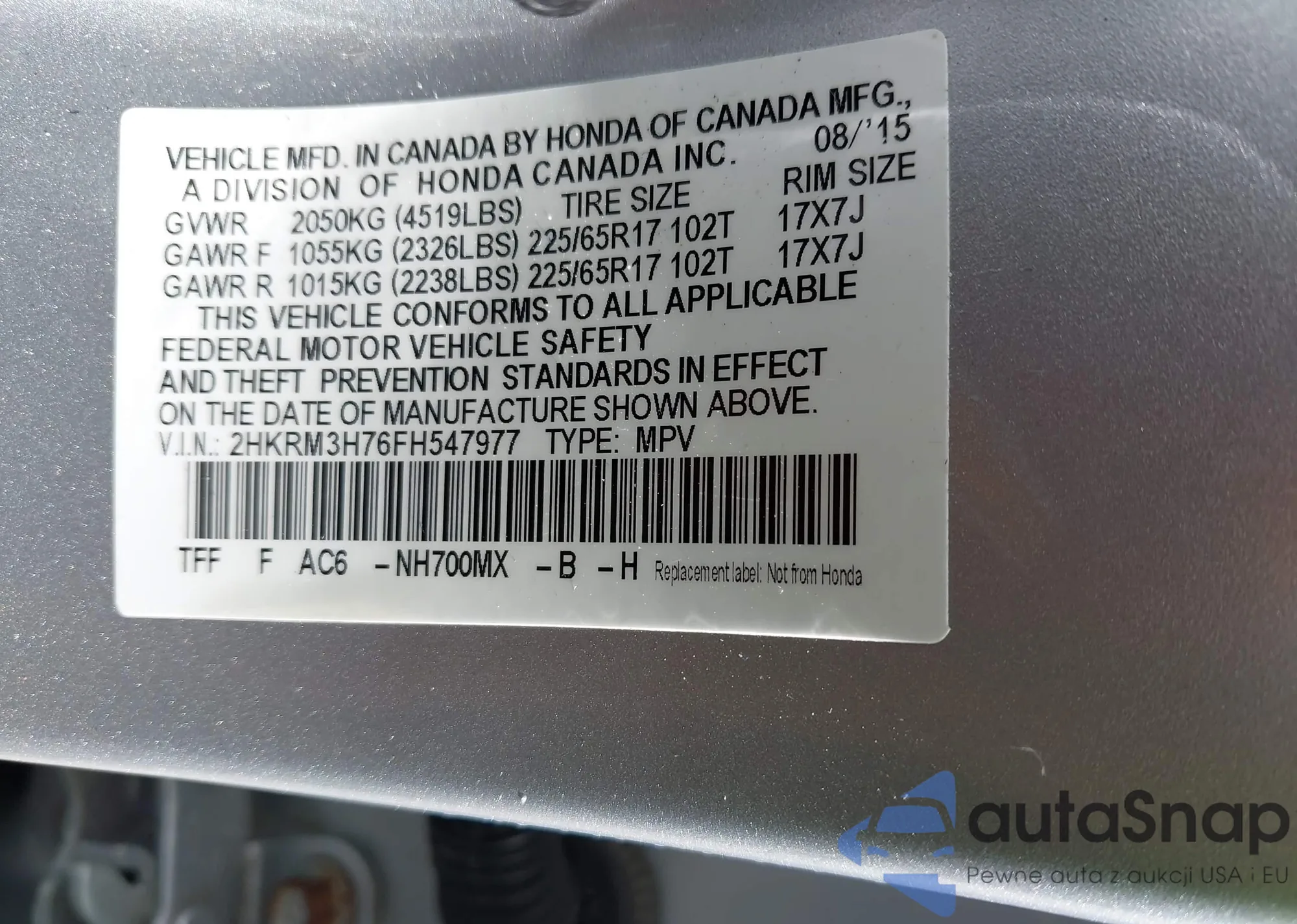 • VIN 2HKRM3H76FH547977