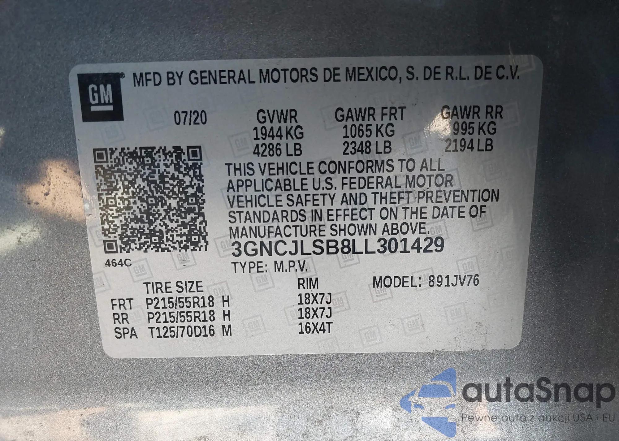 • VIN 3GNCJLSB8LL301429