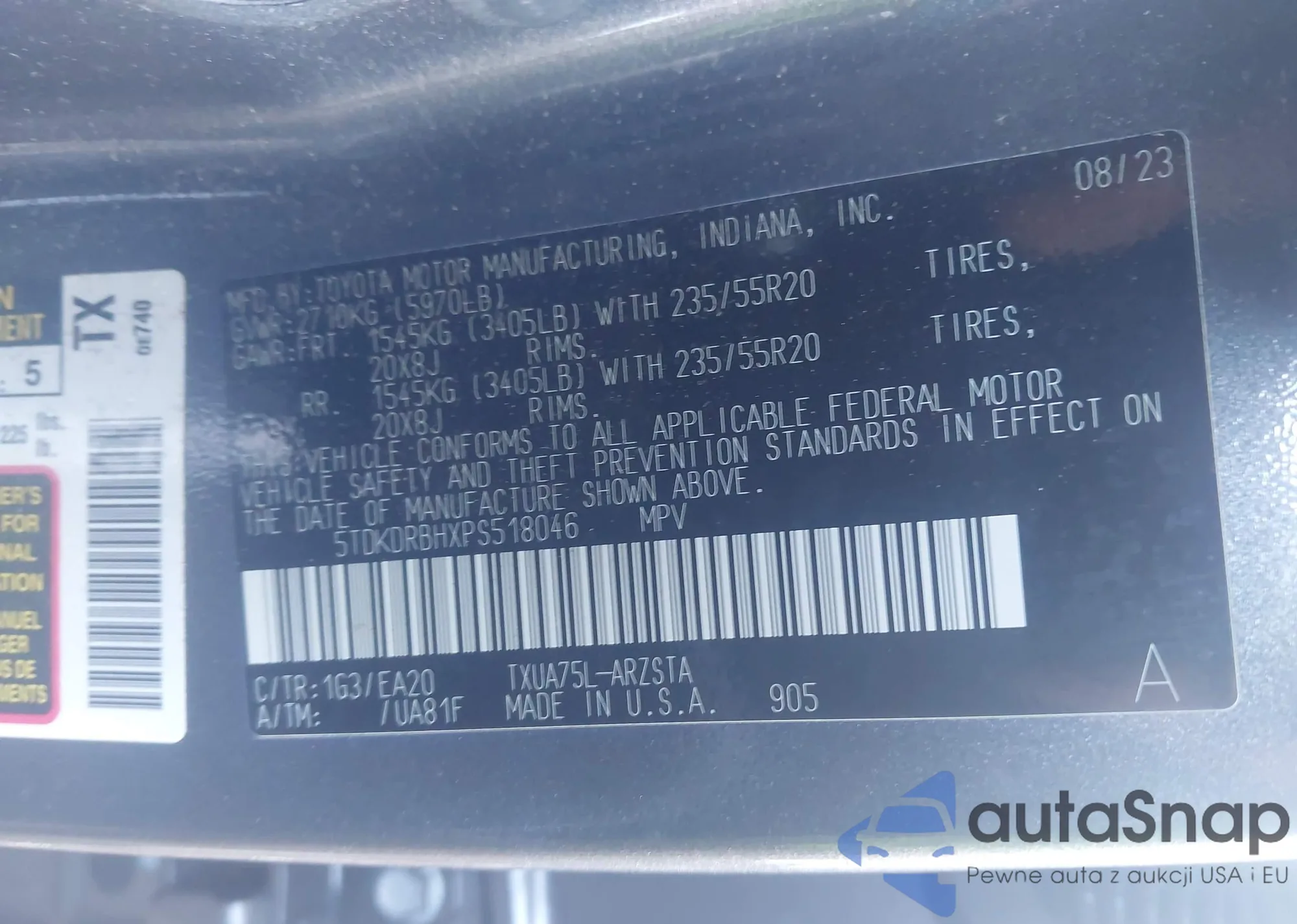 LOT: 43148298 VIN: 5TDKDRBHXPS518046