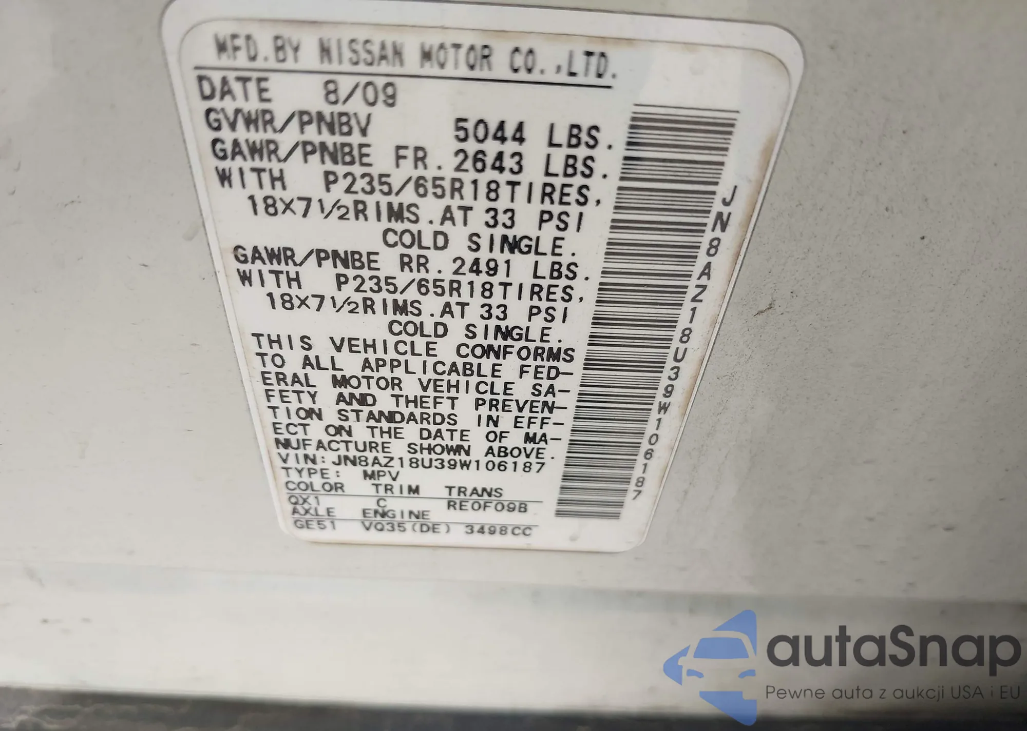 LOT: 42428882 VIN: JN8AZ18U39W106187