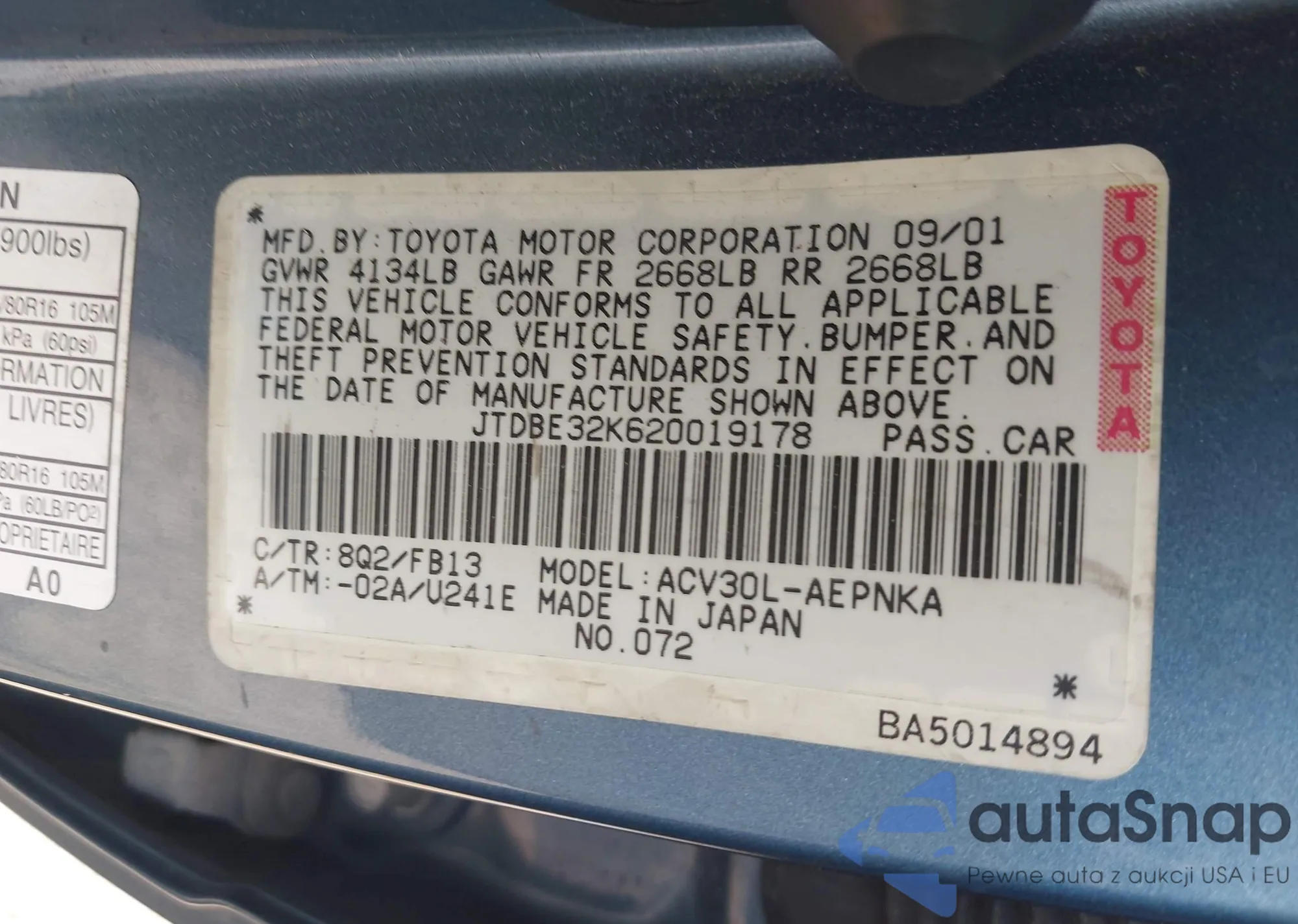 LOT: 43438216 VIN: JTDBE32K620019178