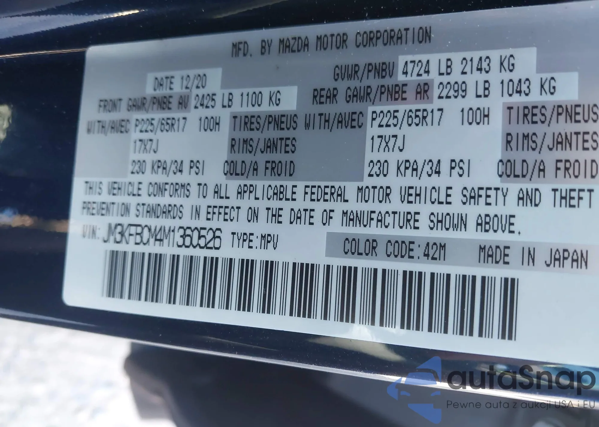 LOT: 43445550 VIN: JM3KFBCM4M1360526