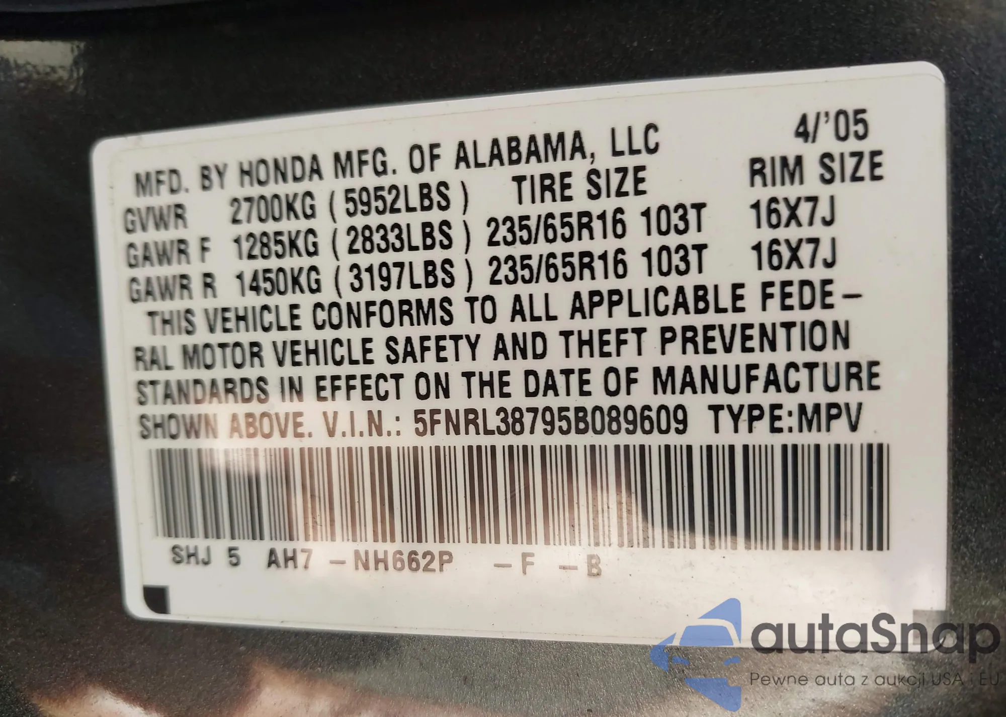 • VIN 5FNRL38795B089609