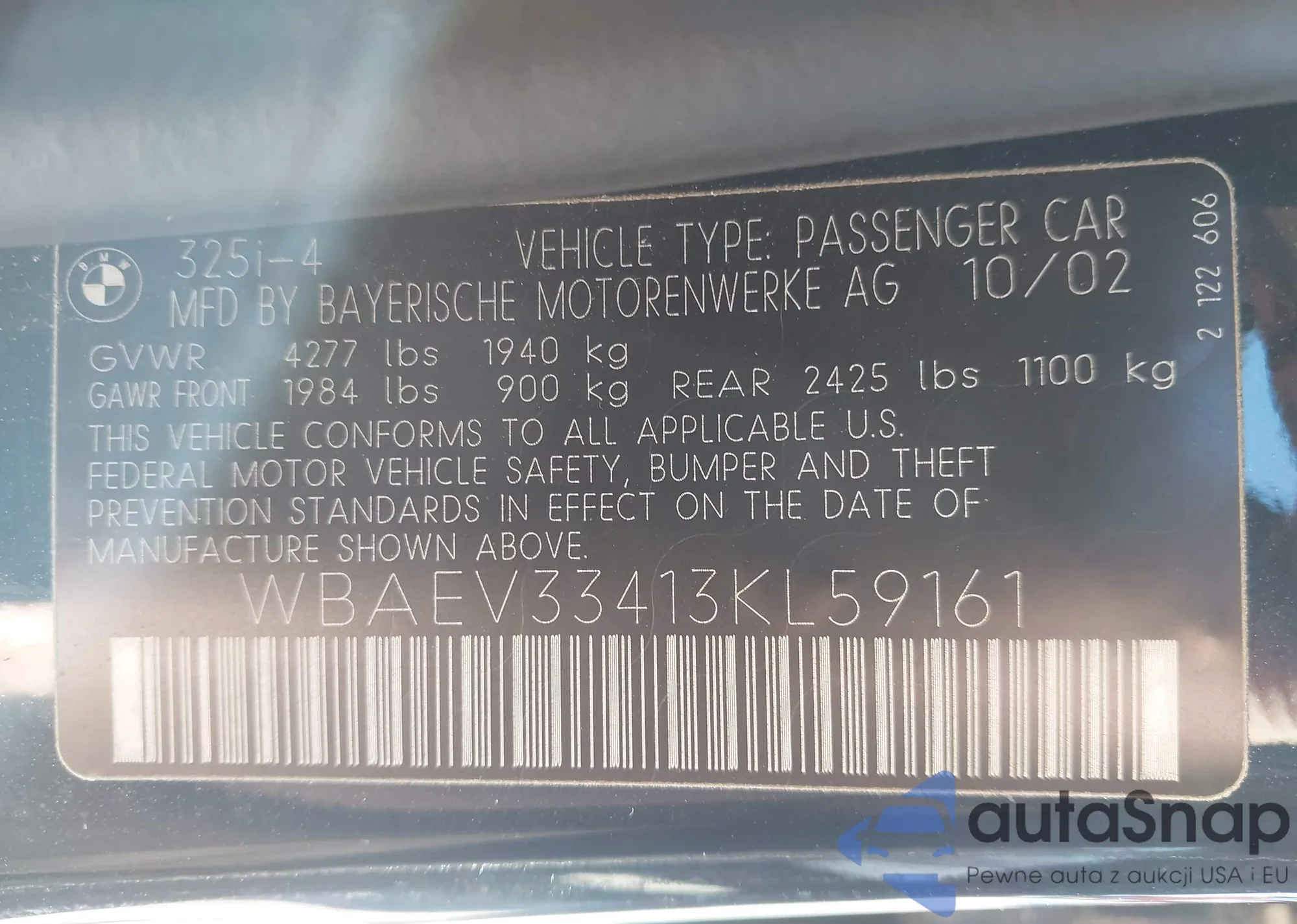 2003 BMW 325I from USA, damaged, VIN WBAEV33413KL59161