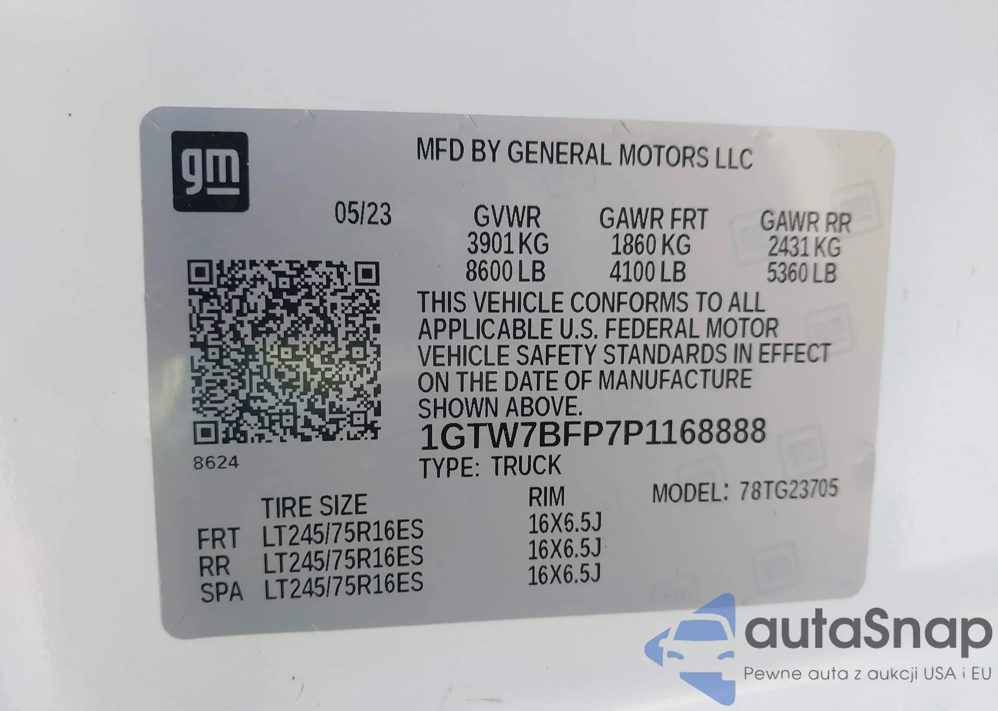 LOT: 43634203 VIN: 1GTW7BFP7P1168888