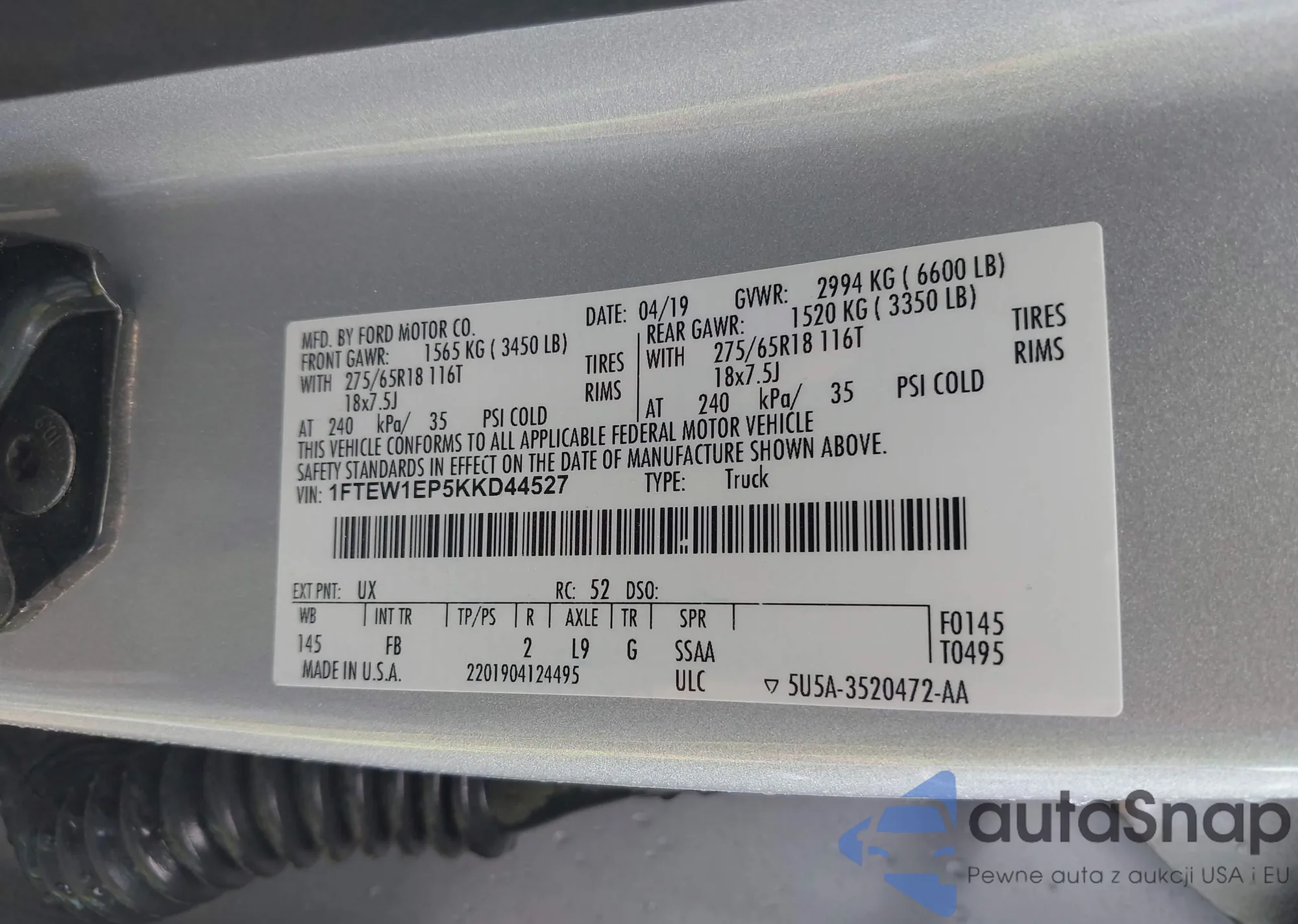 LOT: 43490706 VIN: 1FTEW1EP5KKD44527