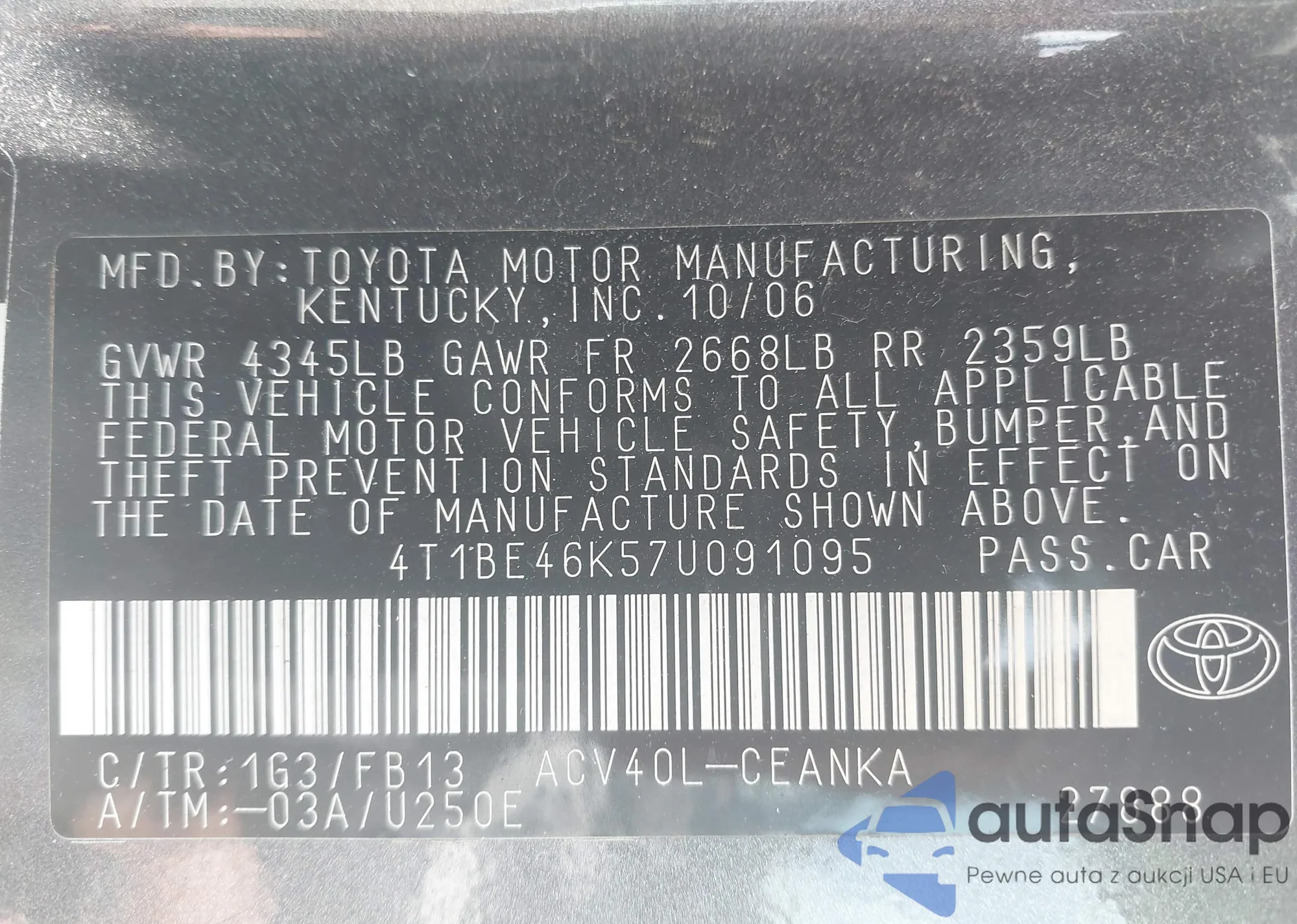 LOT: 43094504 VIN: 4T1C11AK6PU836829