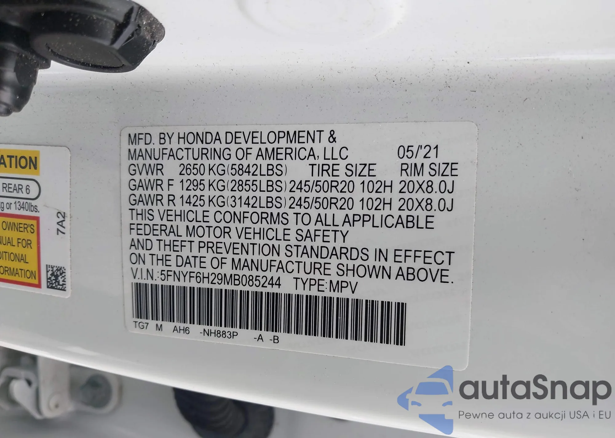 LOT: 43262059 VIN: 5FNYF6H29MB085244
