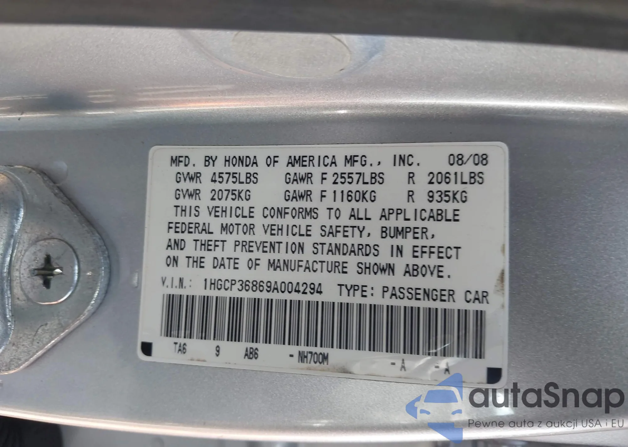 LOT: 43268252 VIN: 1HGCP36869A004294