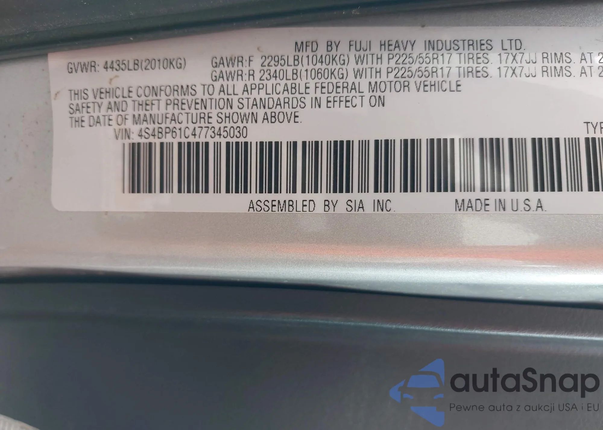 • VIN 4S4BP61C477345030