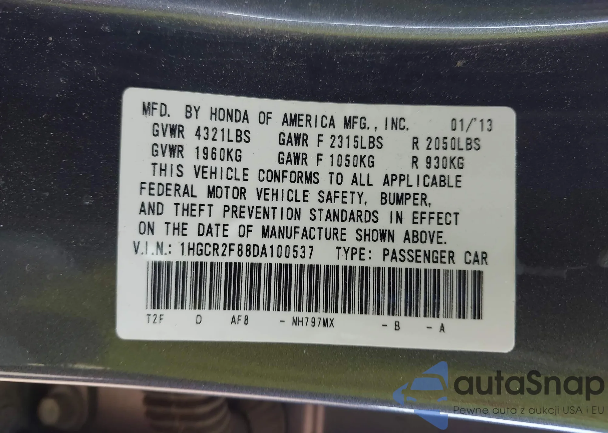 • VIN 1HGCR2F88DA100537