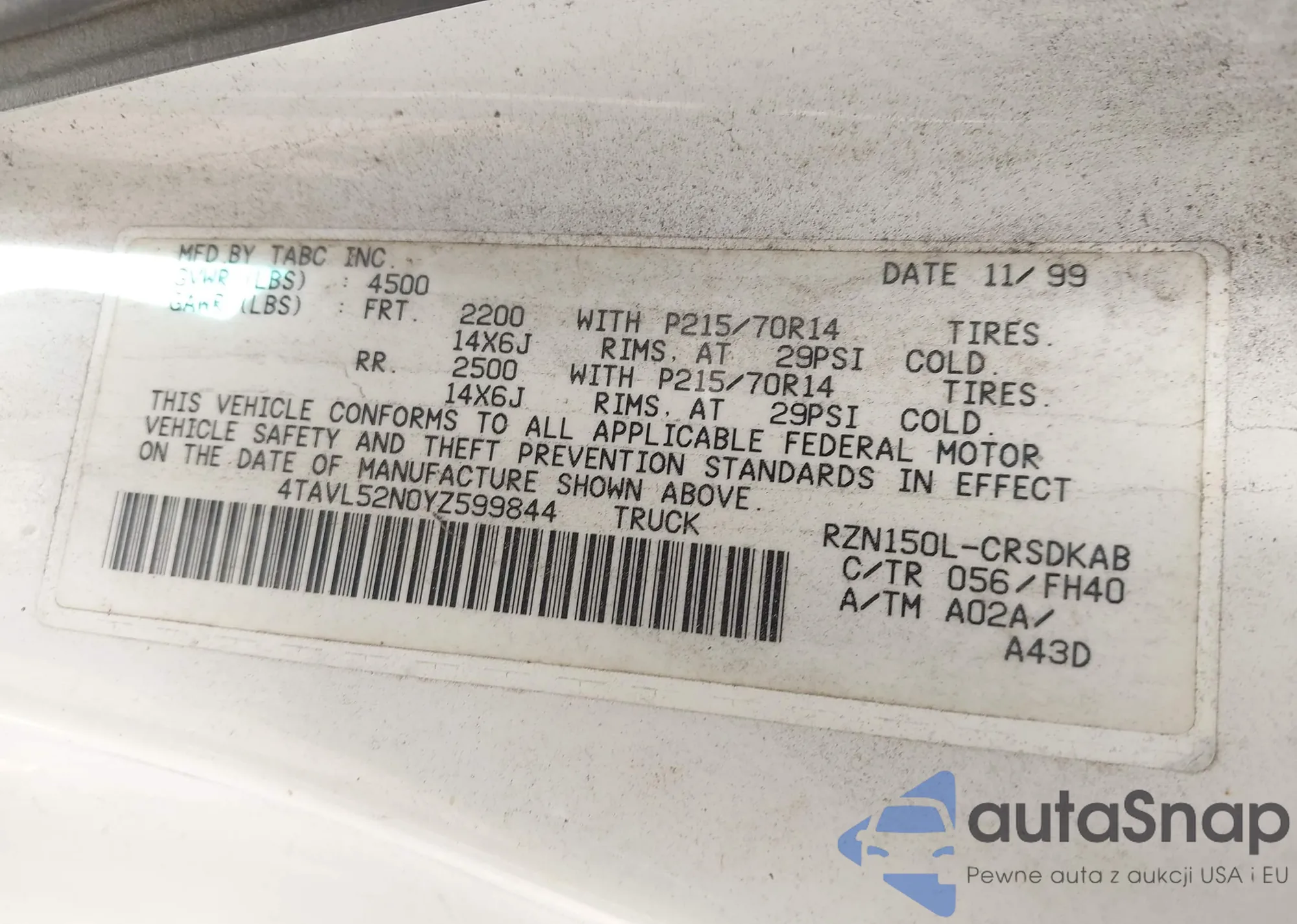 • VIN 4TAVL52N0YZ599844