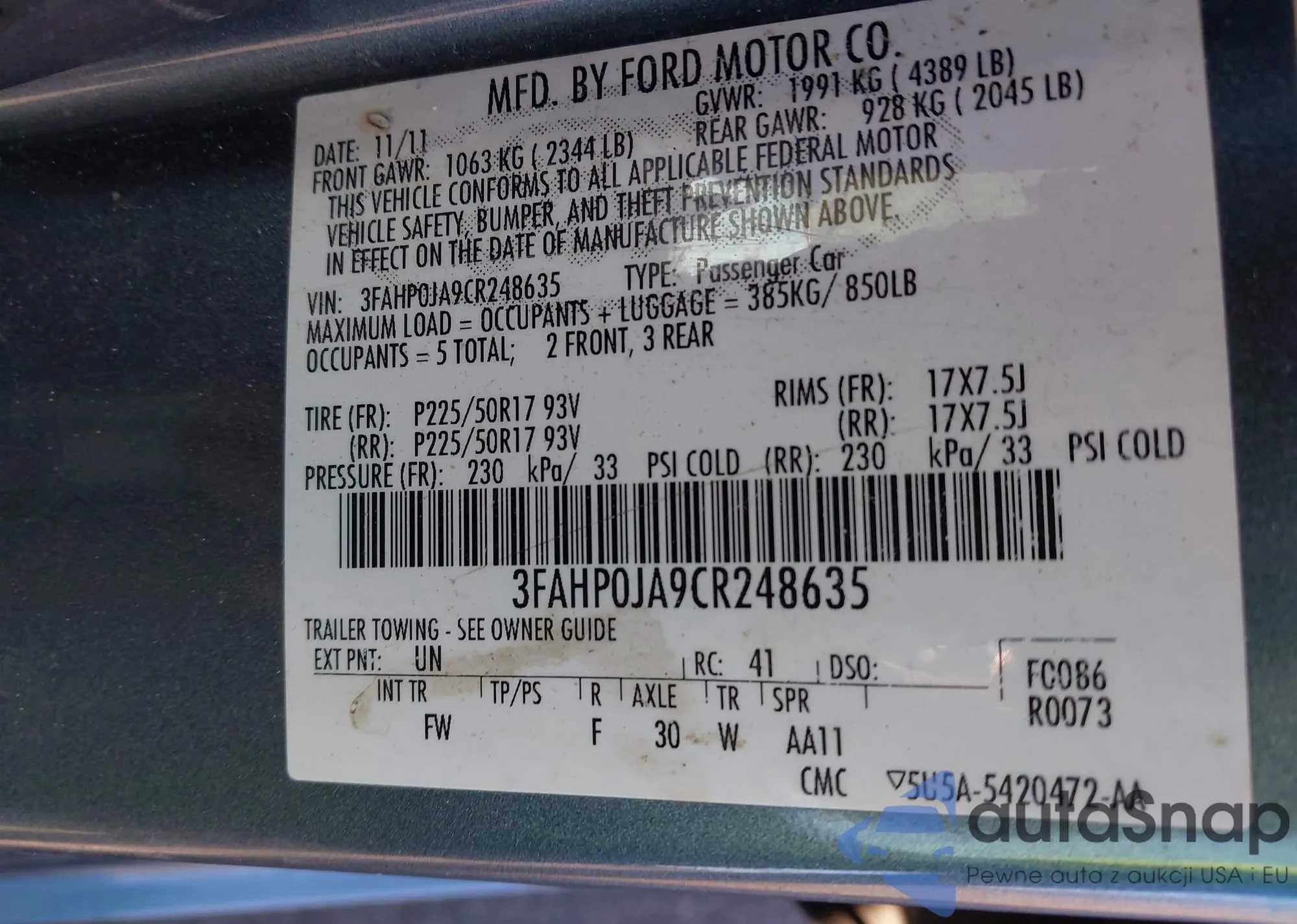 • VIN 3FAHP0JA9CR248635