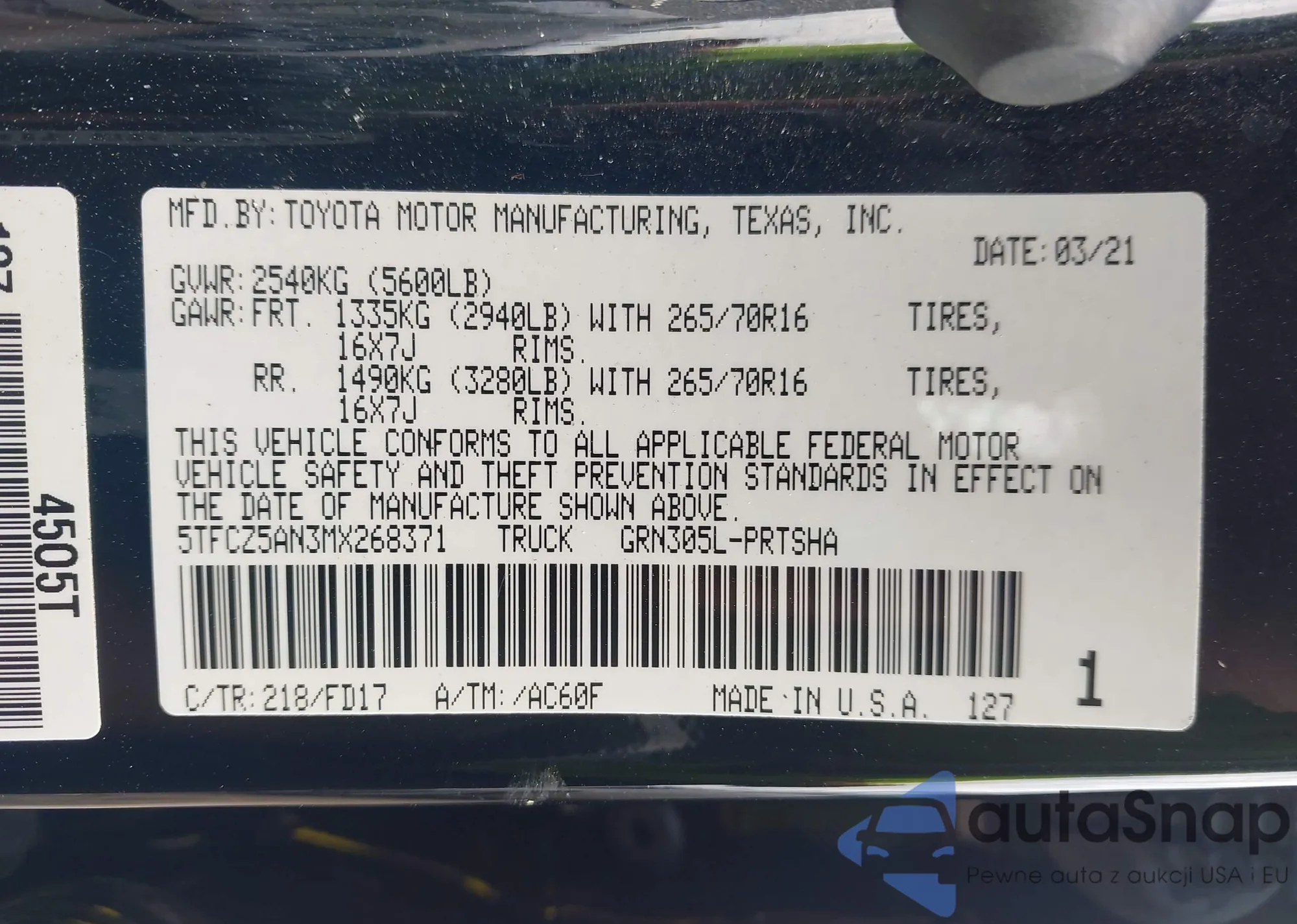 • VIN 5TFCZ5AN3MX268371