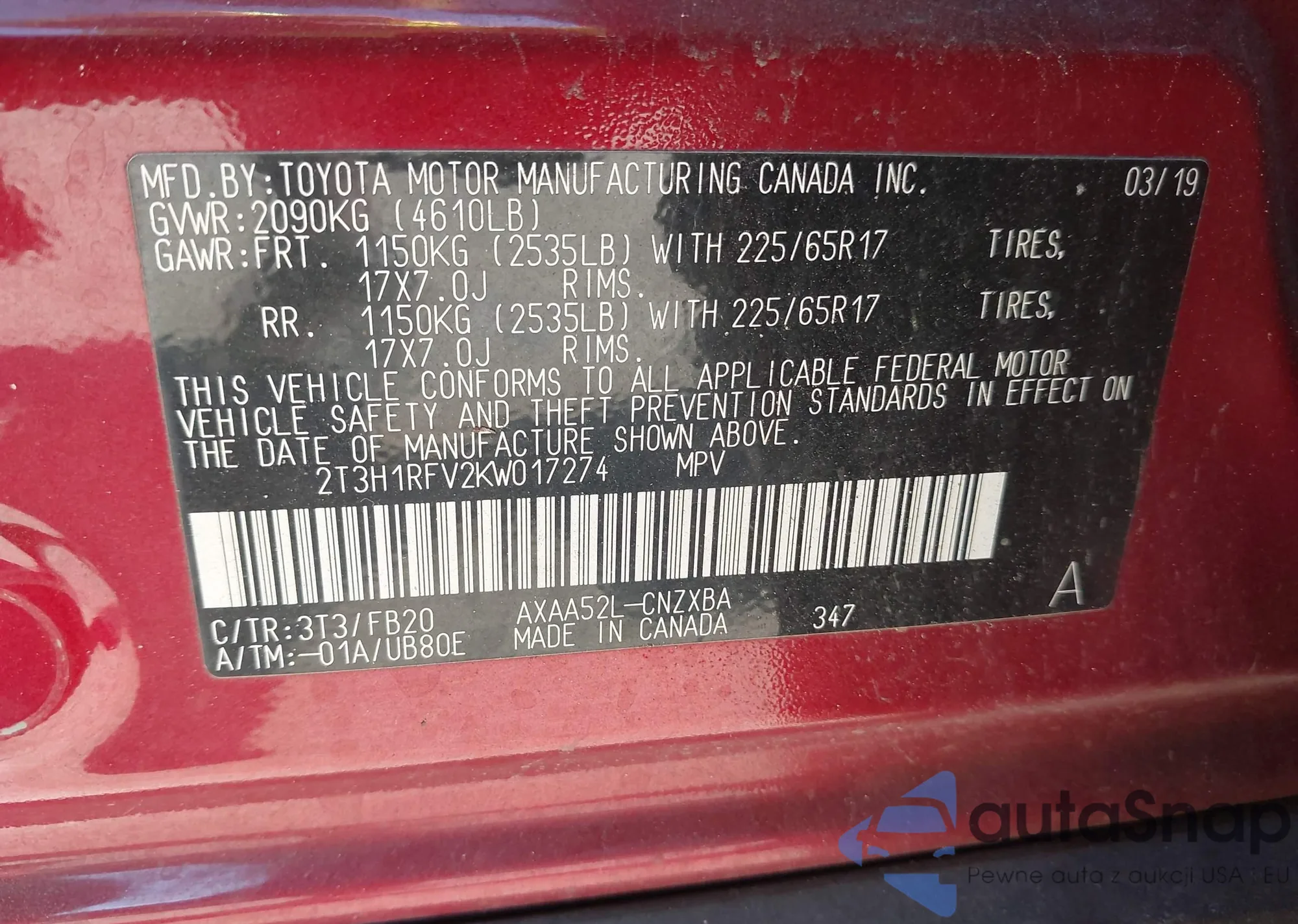 • VIN 2T3H1RFV2KW017274