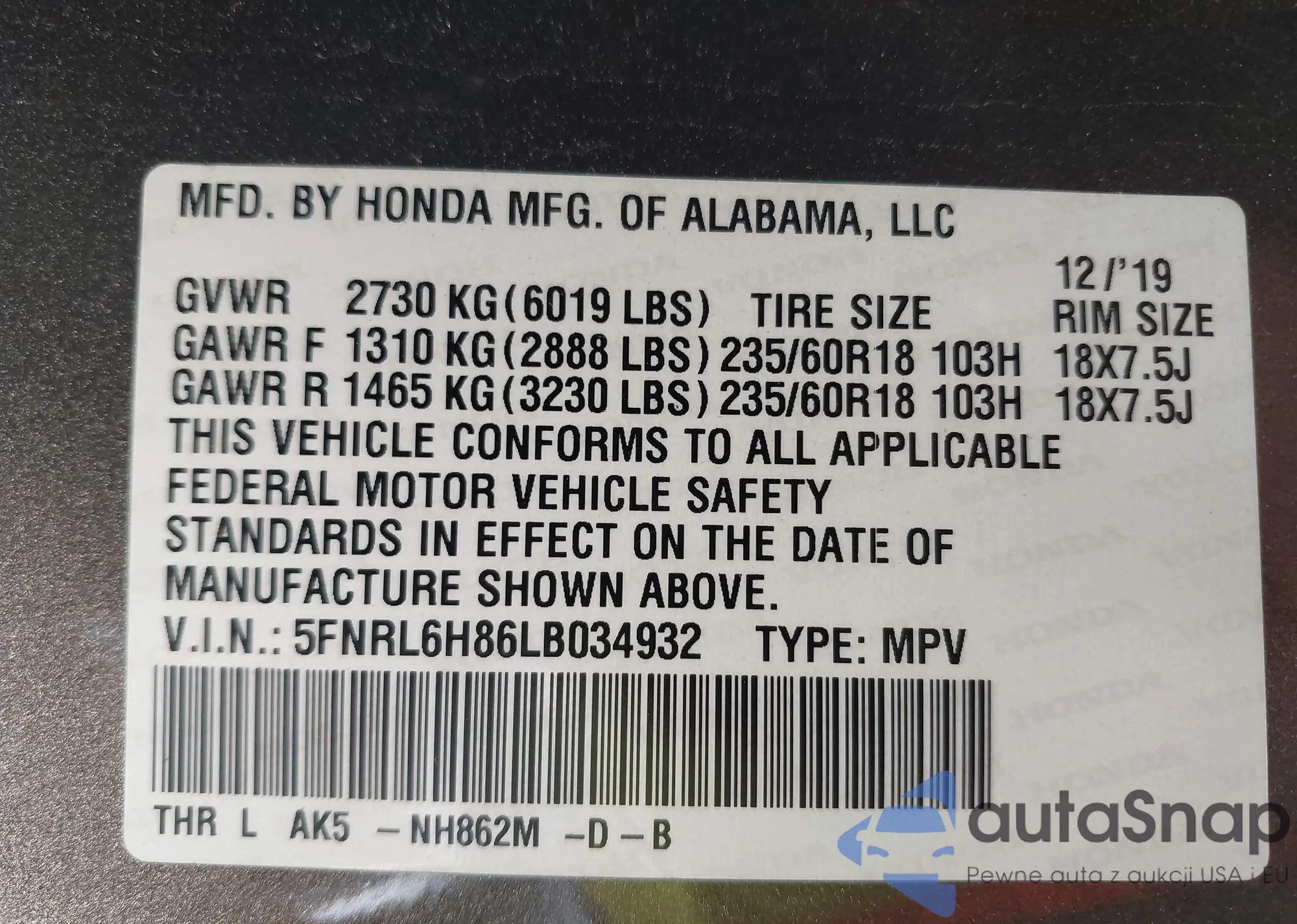 • VIN 5FNRL6H86LB034932
