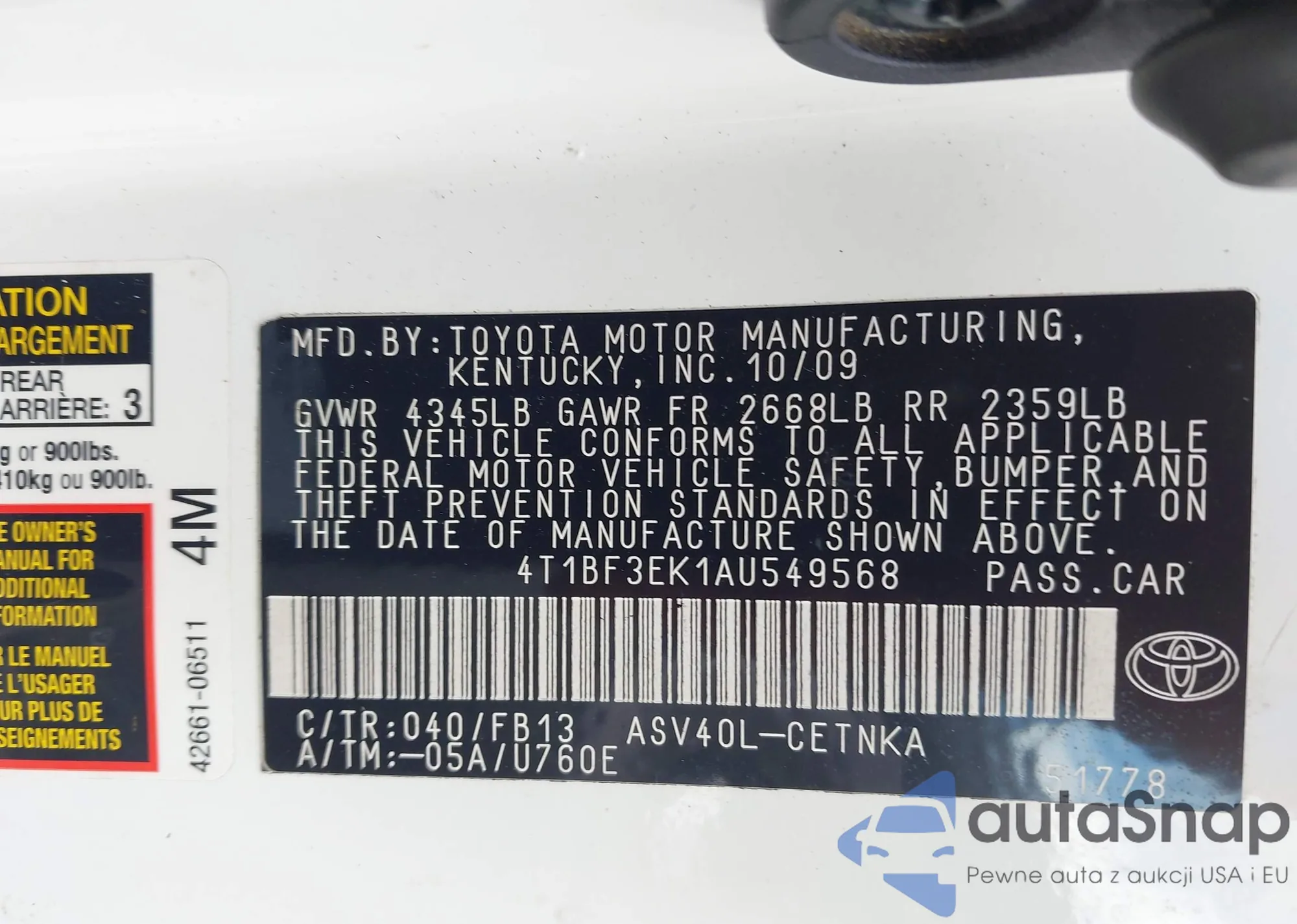 LOT: 43284300 VIN: 4T1BF3EK1AU549568