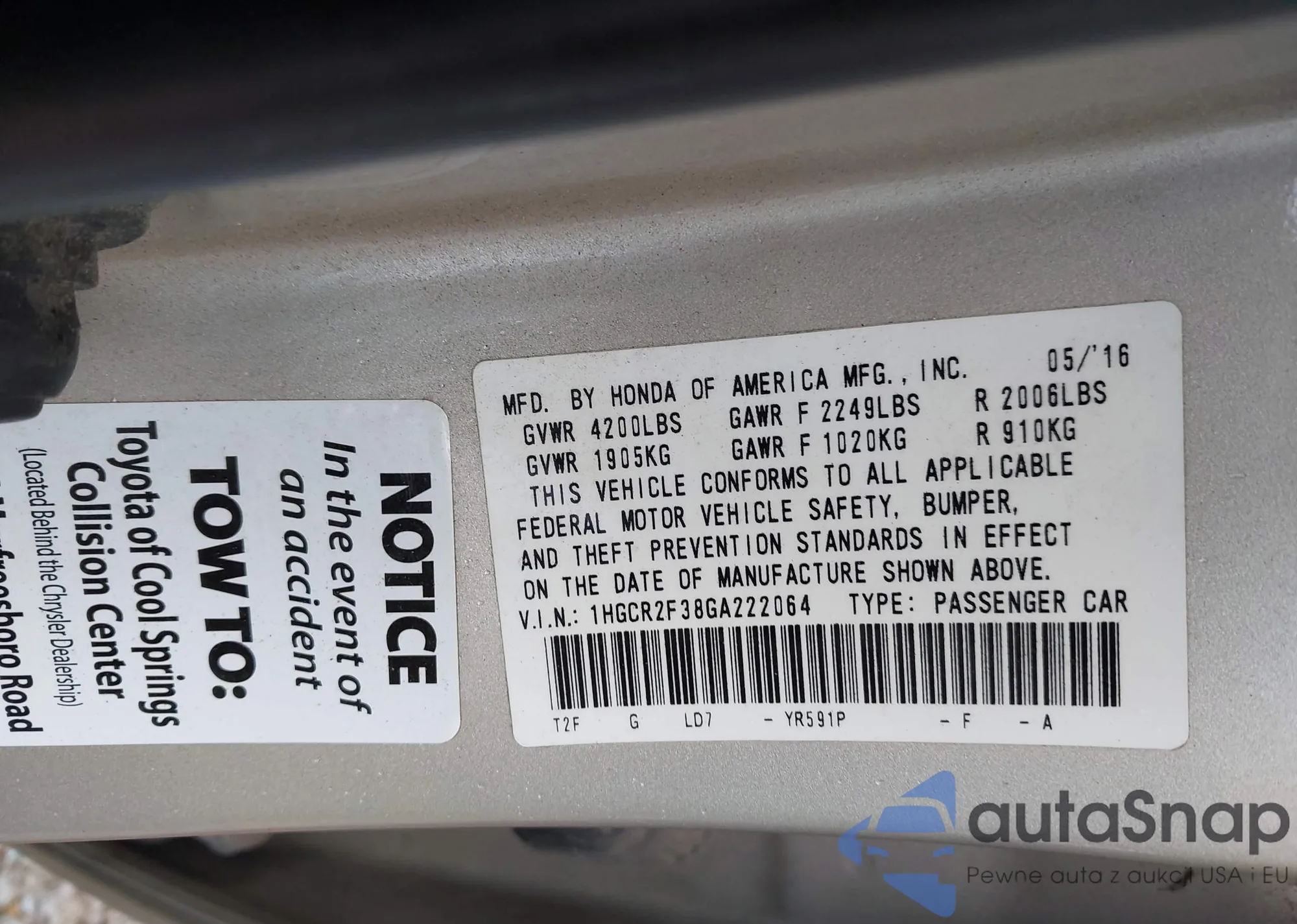 LOT: 42285711 VIN: 1HGCR2F38GA222064