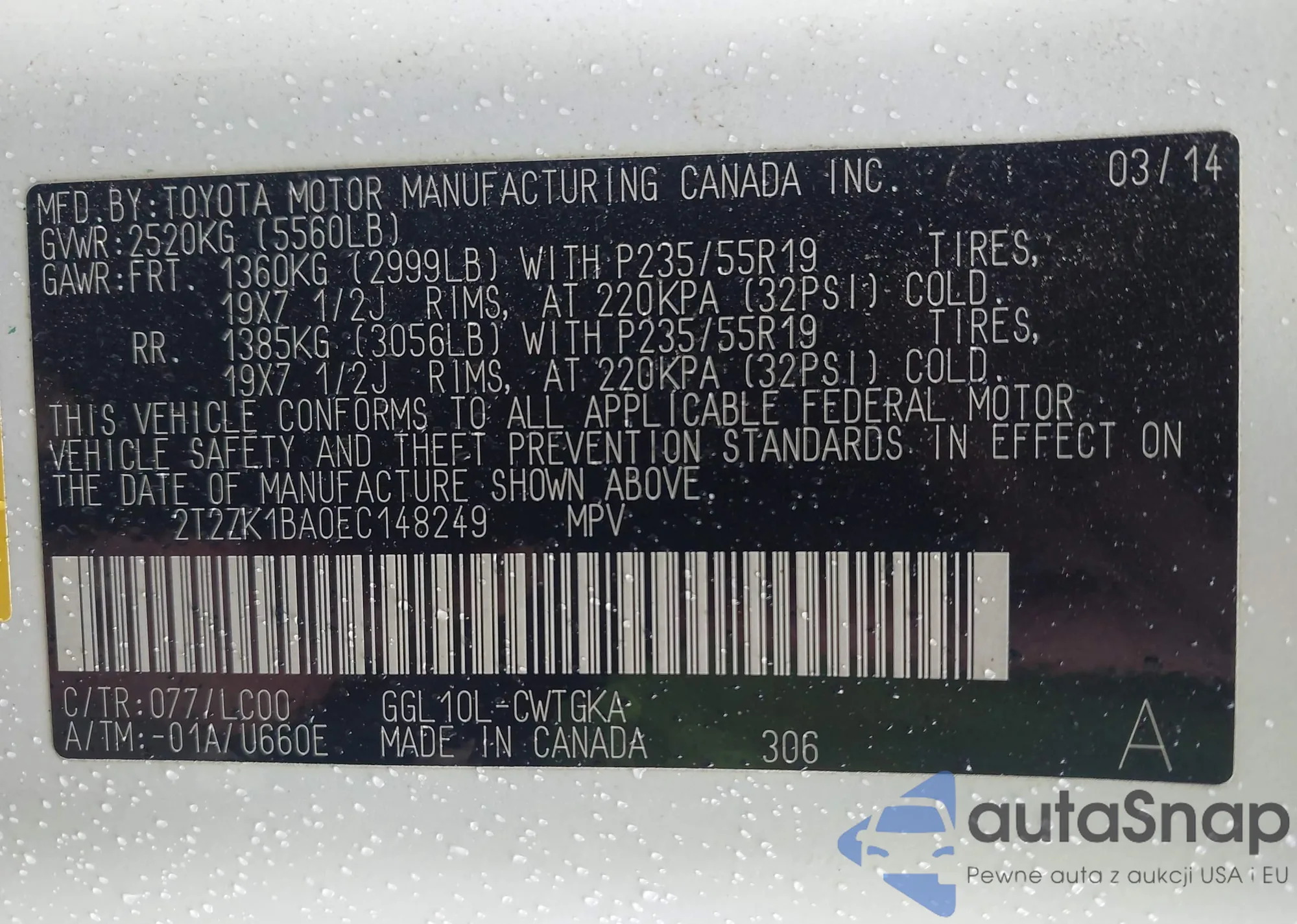 • VIN 2T2ZK1BA0EC148249