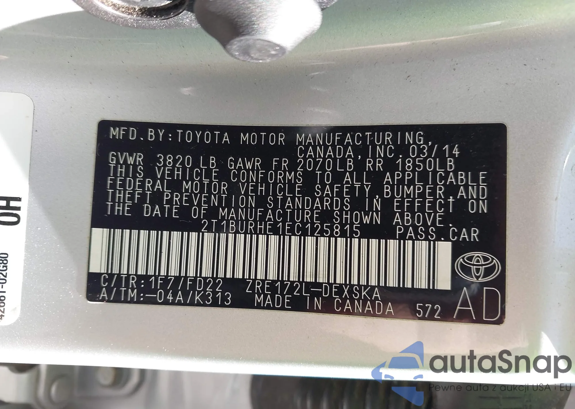 LOT: 43353491 VIN: 2T1BURHE1EC125815
