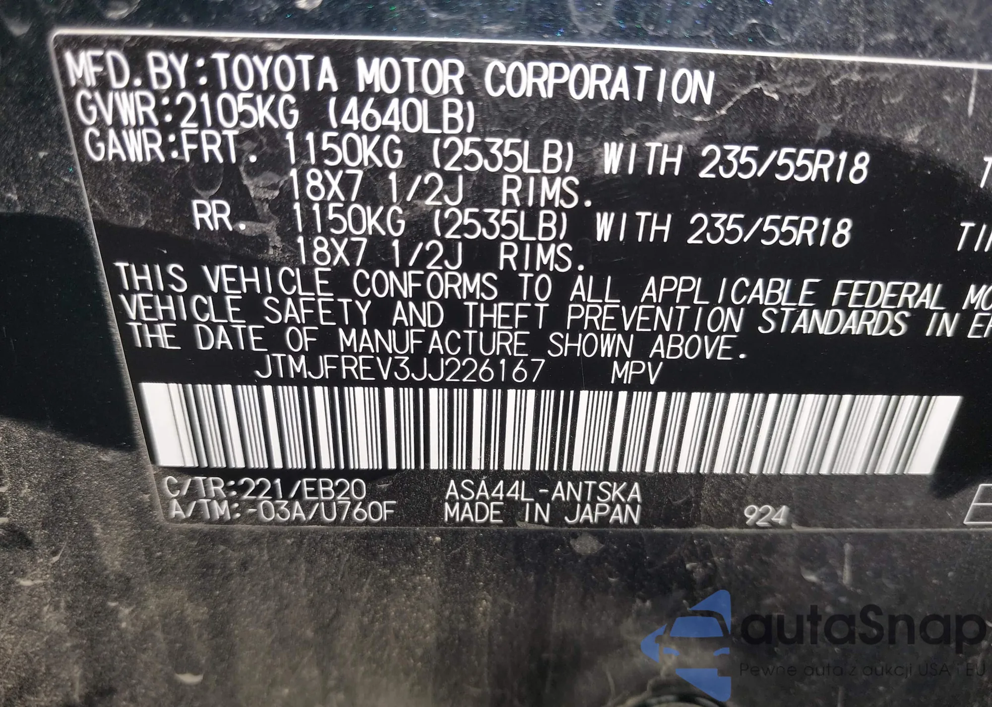 LOT: 43318432 VIN: JTMJFREV3JJ226167