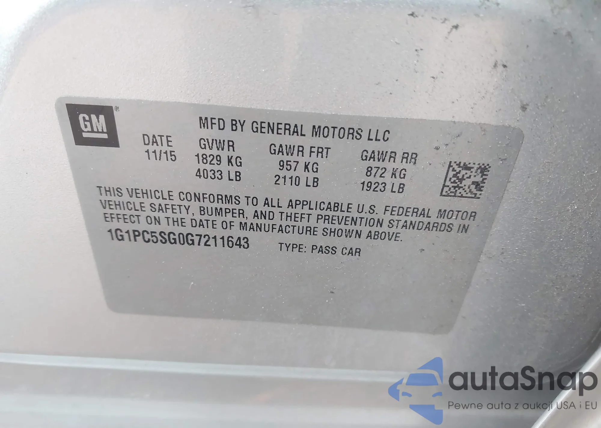 LOT: 43342069 VIN: 1G1PC5SG0G7211643