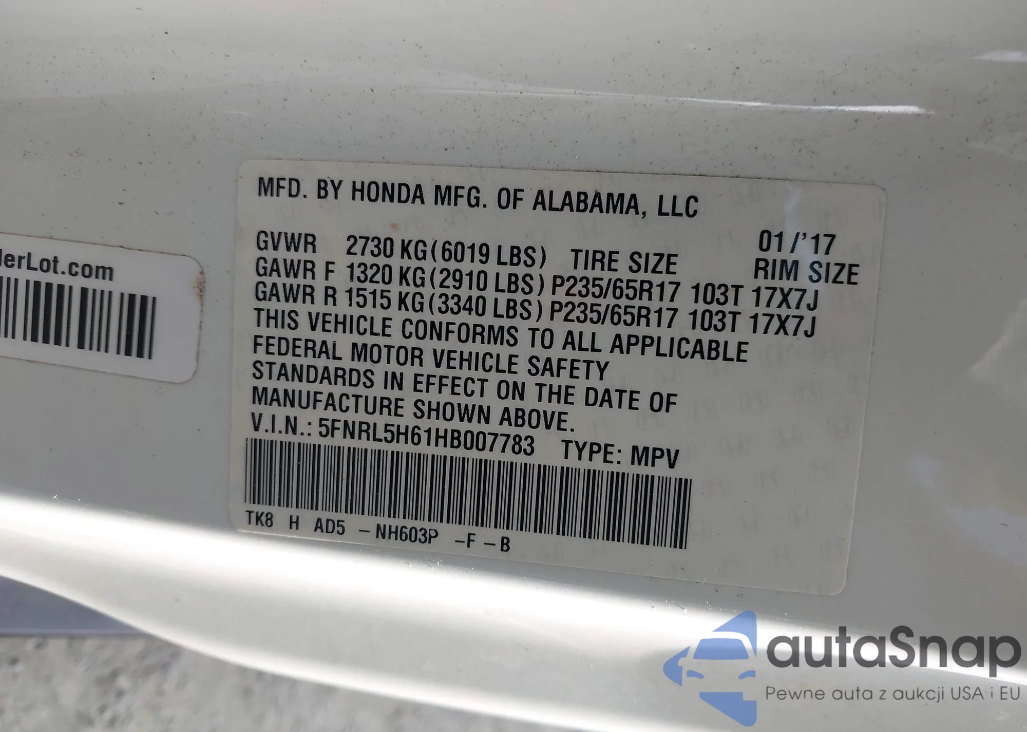 • VIN 5FNRL5H61HB007783