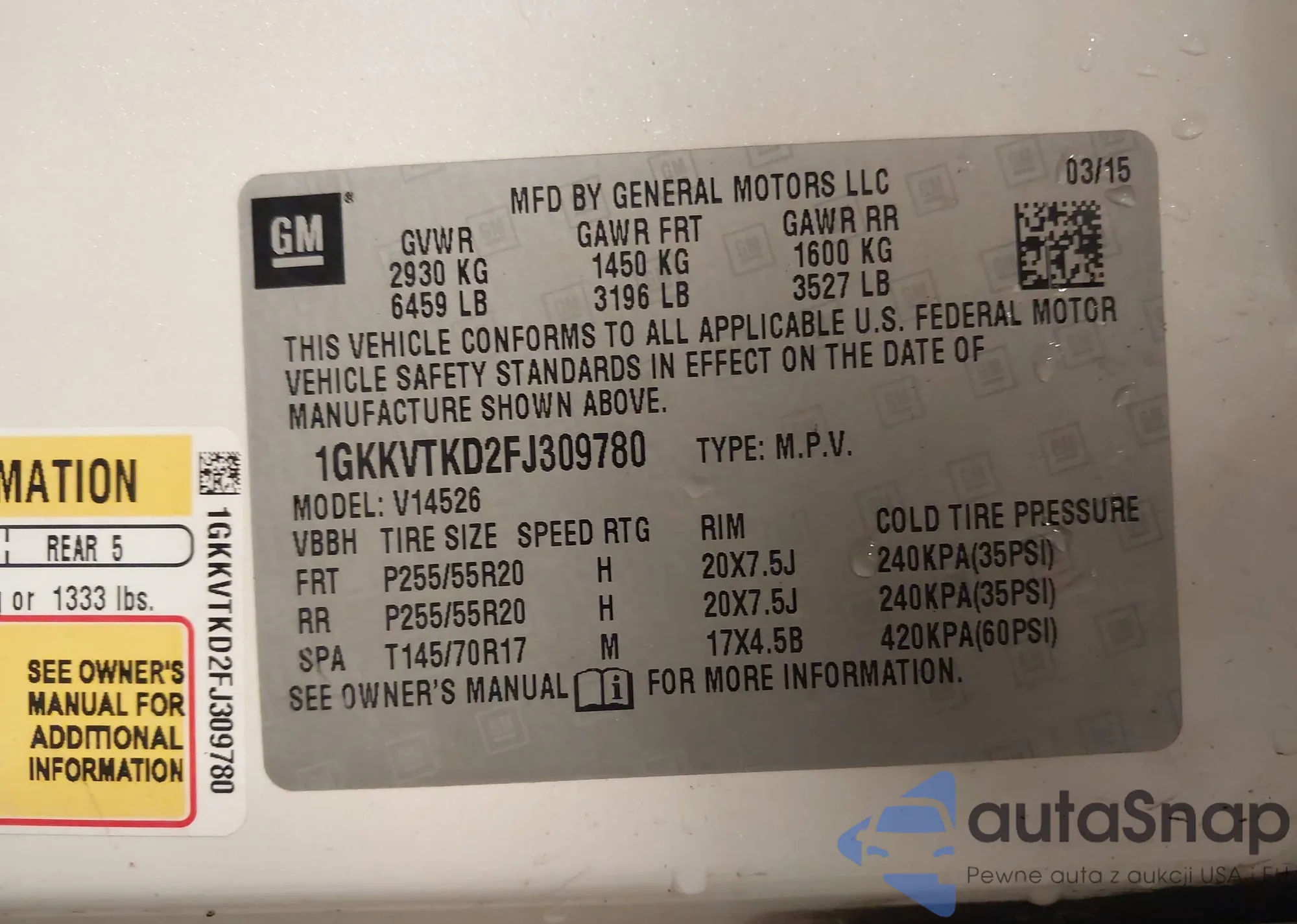 • VIN 1GKKVTKD2FJ309780