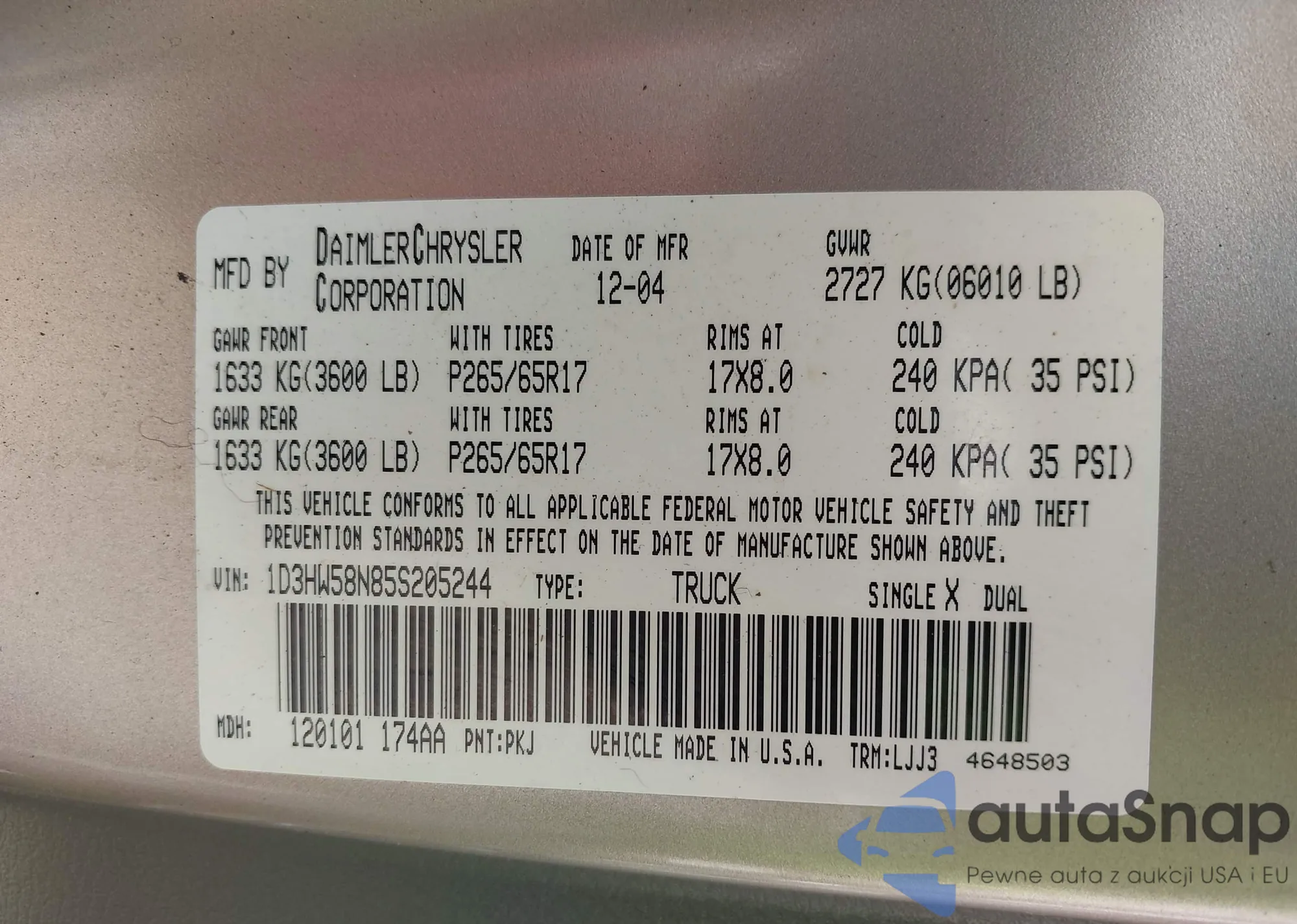 • VIN 1D3HW58N85S205244