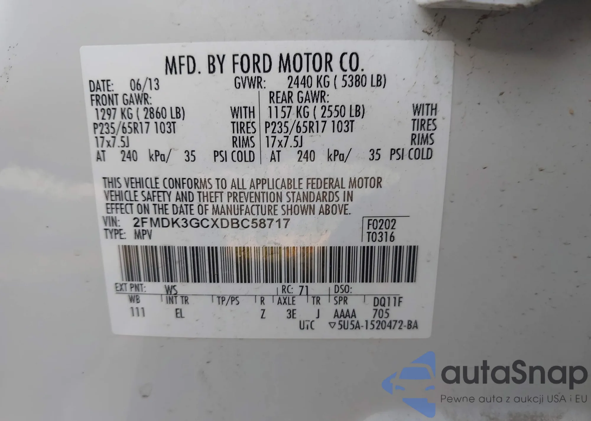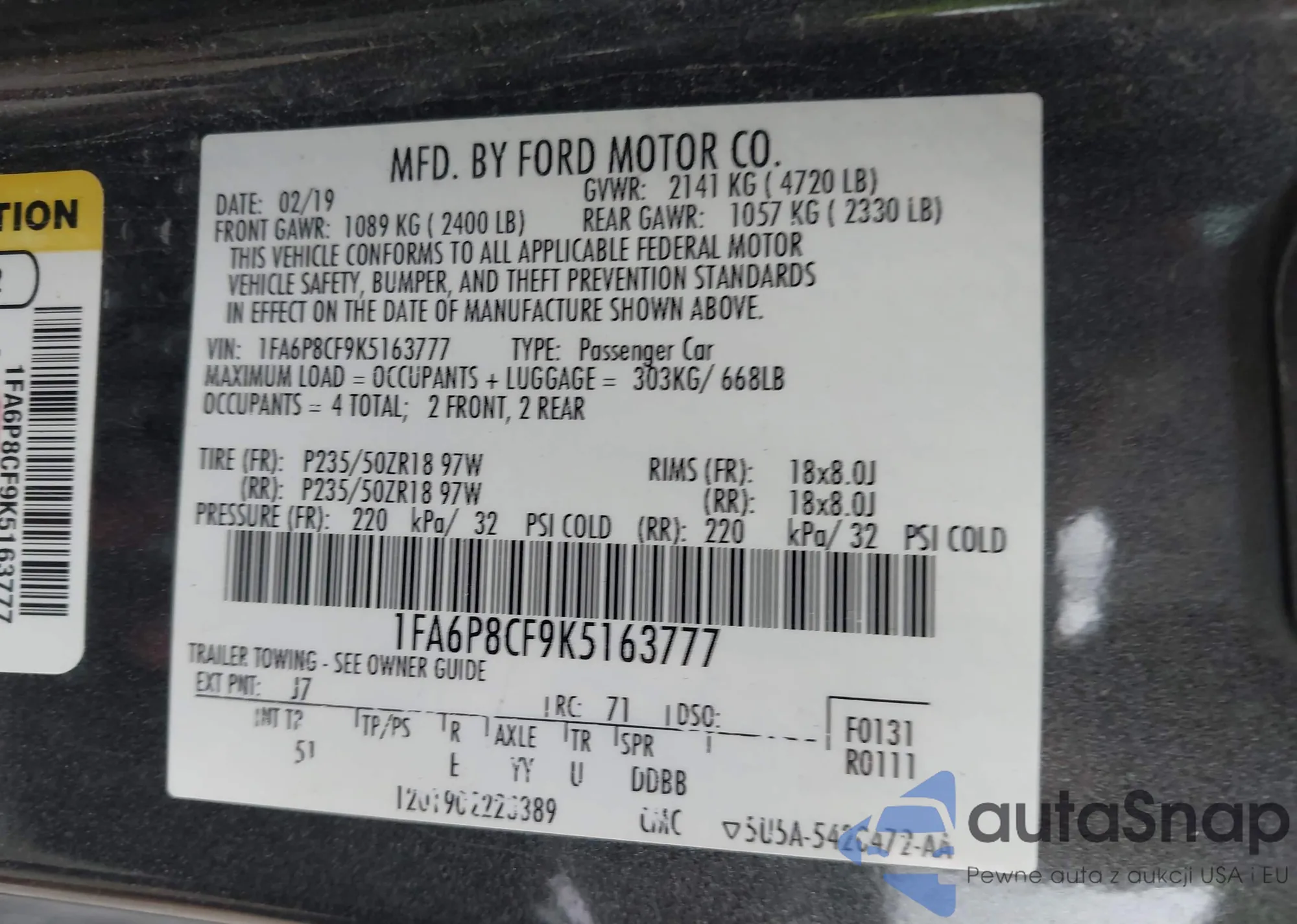 • VIN 1FA6P8CF9K5163777