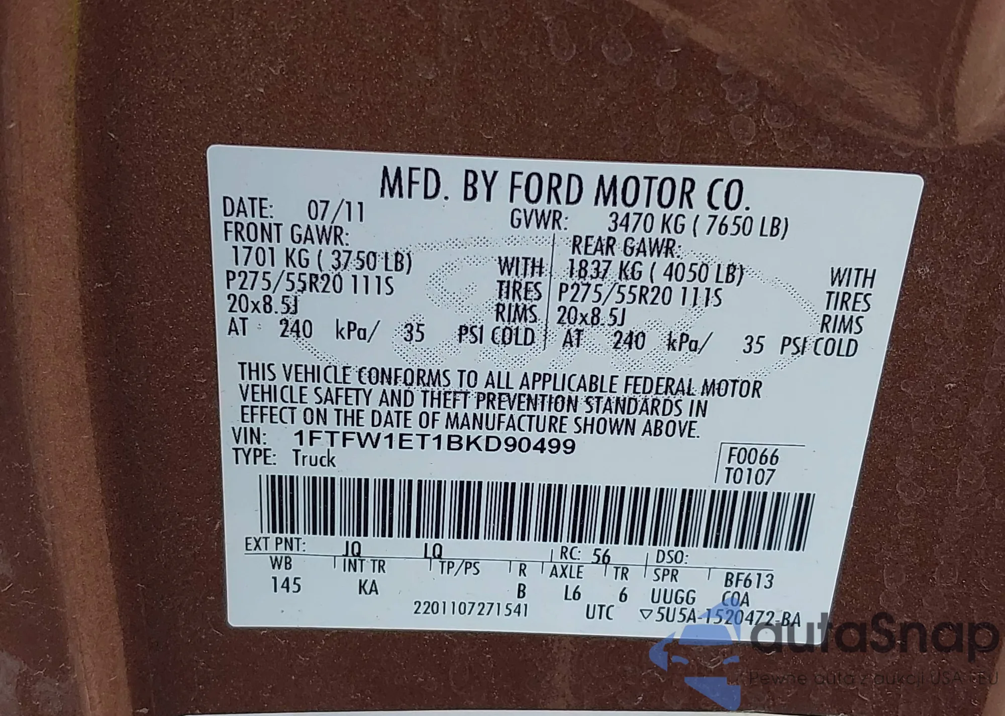 • VIN 1FTFW1ET1BKD90499