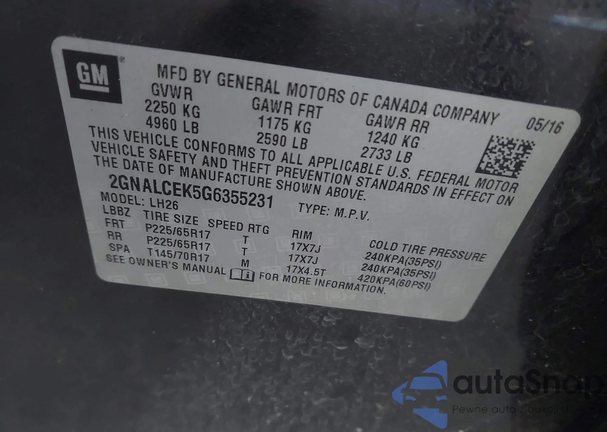 • VIN 2GNALCEK5G6355231
