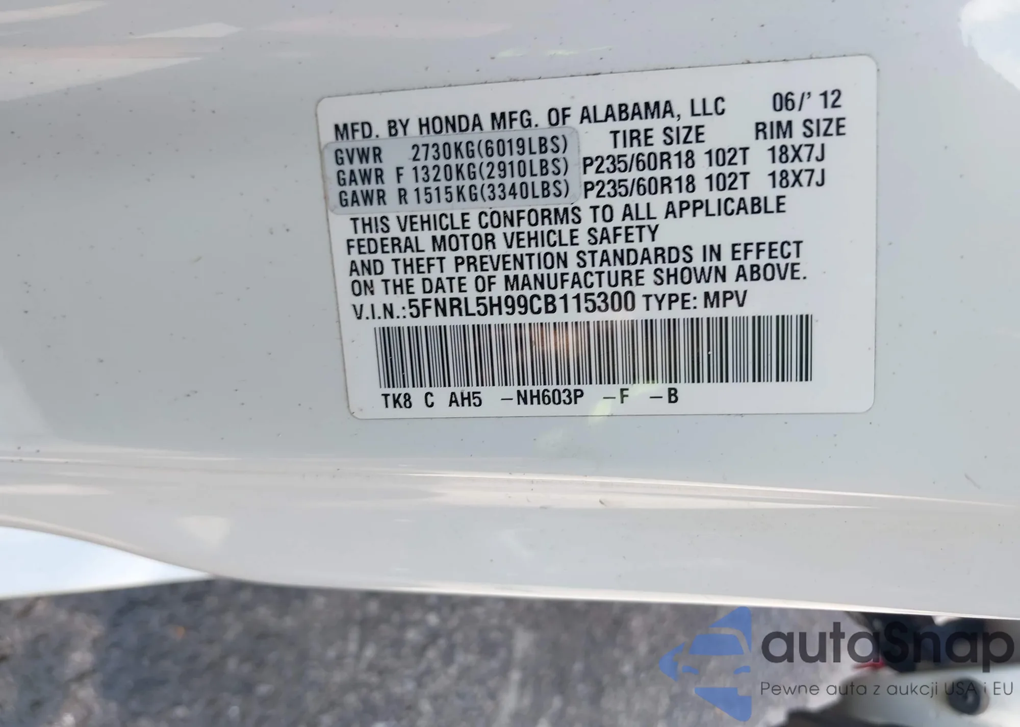 • VIN 5FNRL5H99CB115300